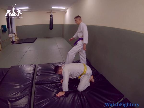 Ripped Hugo's workout interrupted by Kee-a-fas - gutpunch choke
