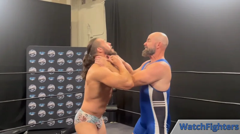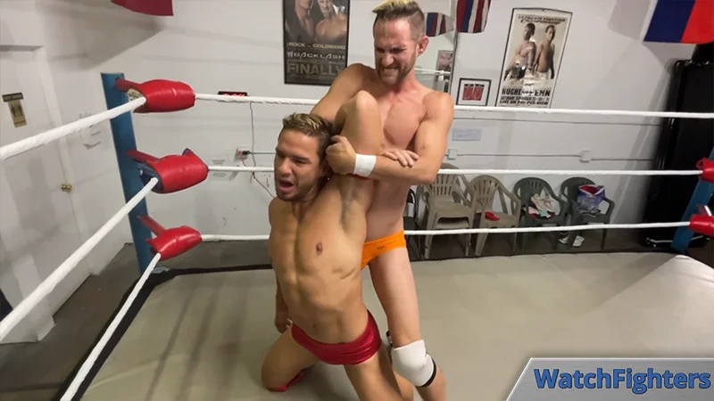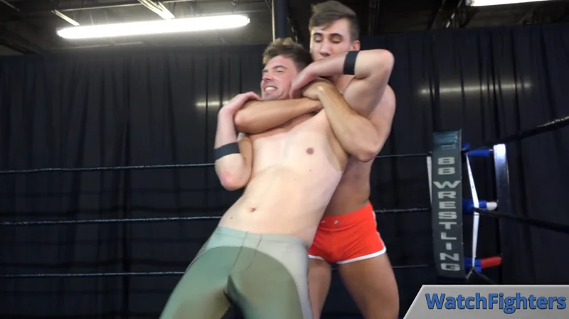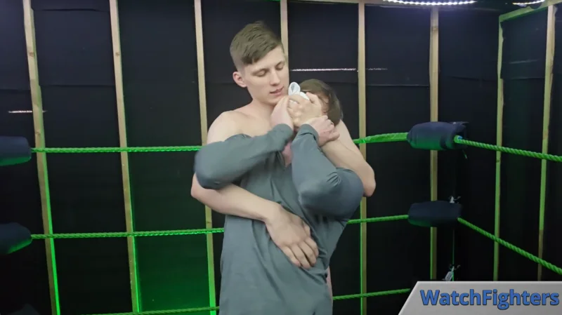 Jett manages to lock on an early standing sleeper on Ethan, which shows off his body nicely for us. The struggle between the two is just starting to heat up, but Jett is in control and keeps it going while he outmaneuvers his opponent.