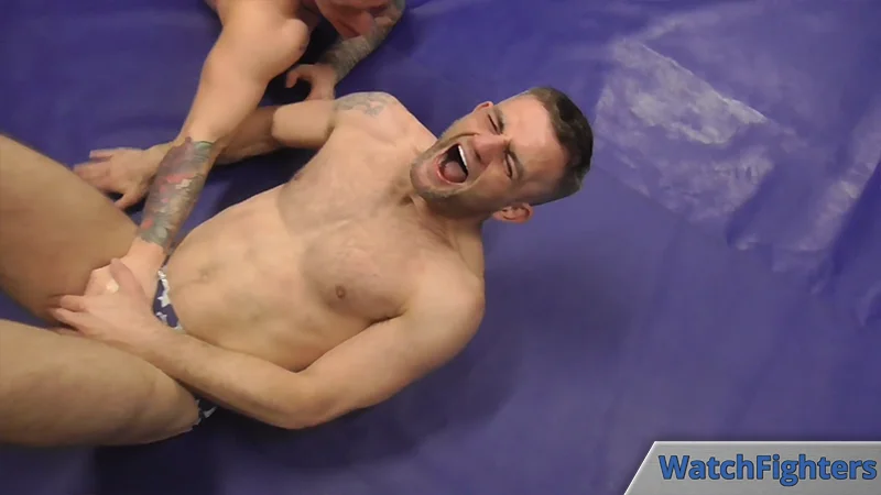 Jett manages to tough it out, so Ethan finishes off round 2 with another double armhook. You can see it in his eyes, he loves doing this to a man, and we love him for loving it! Jett looks fantastic like this, too; he suffers well, and we love him for it.