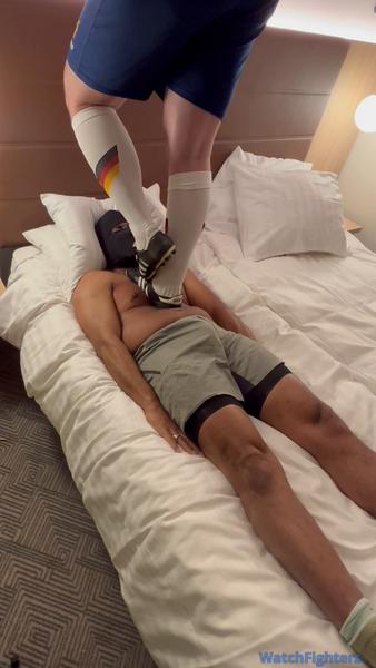 In this video MasterTim tramples Skyjoe with his Giant socked feet. He uses his 145kG of weight and power on Skyjoe till he finally taps out….