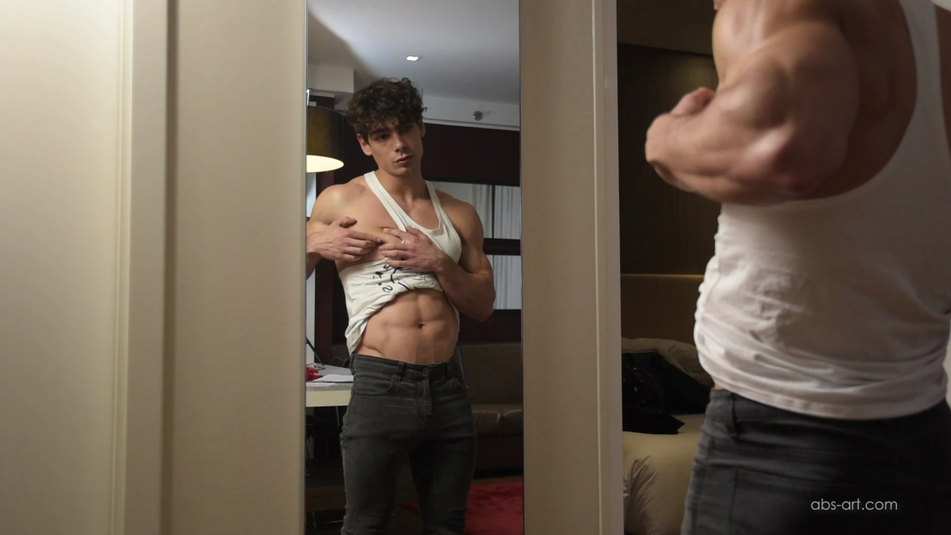 Bruno is enjoying himself at the mirror, when Andrew notices him and stares him. They start to play with each other's nipples, and worship each other's muscles, but the passion rises up and they continue with a hot submission-domination match focusing on nipples and bulges. (NO NUDITY IN THIS ONE)