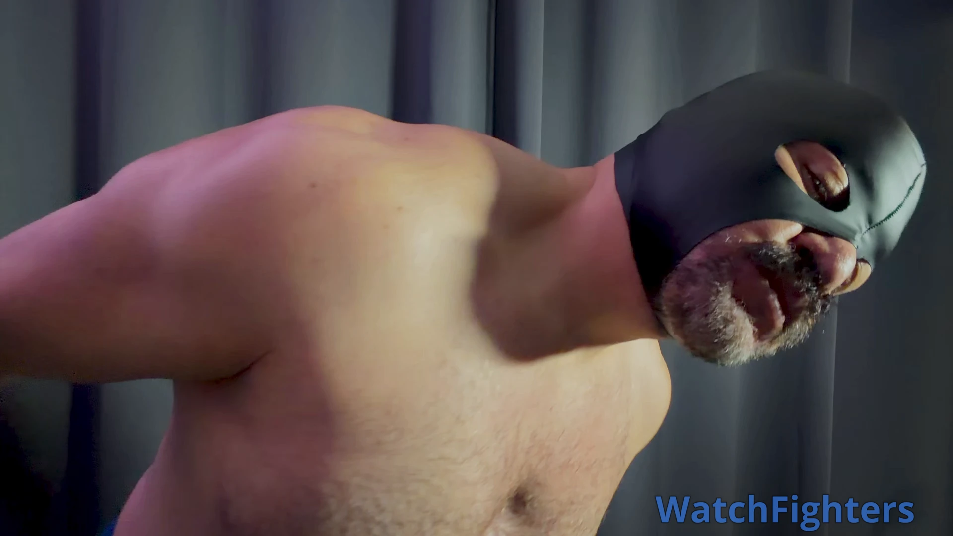 The Gear & Muscle: Close-up focus on the tension of the mask and the physique of the luchador.