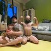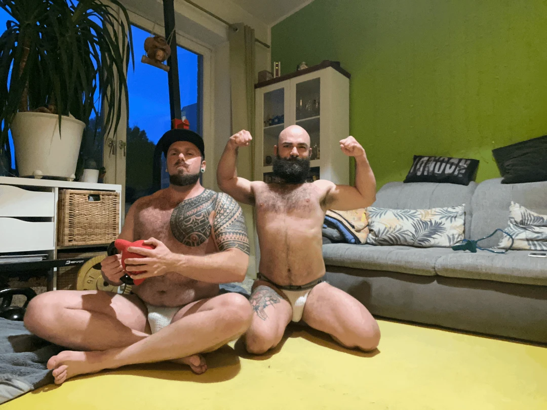 Jockstrap action with a lot of choke, bearhug, lift, camel clutch and more!
