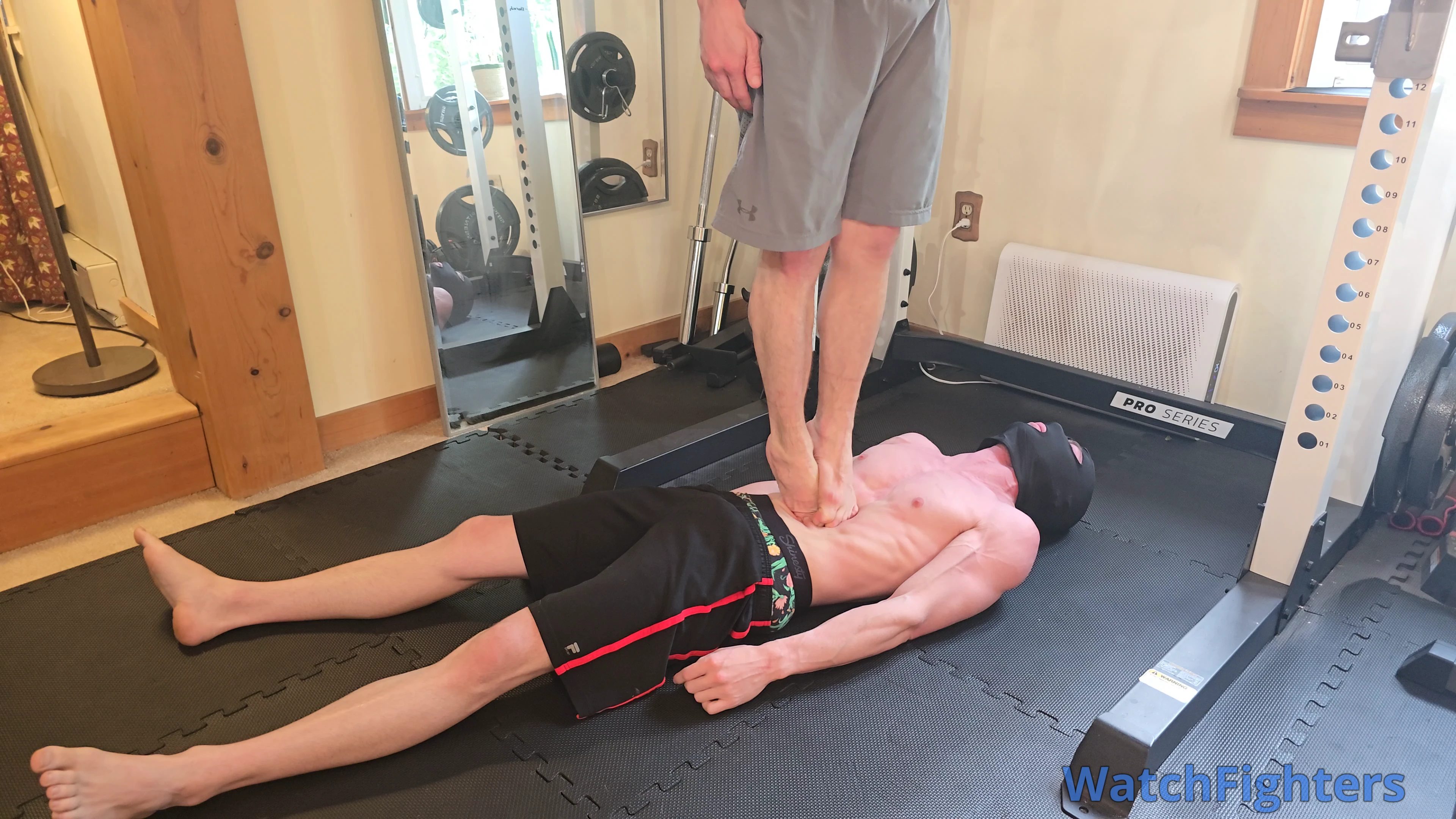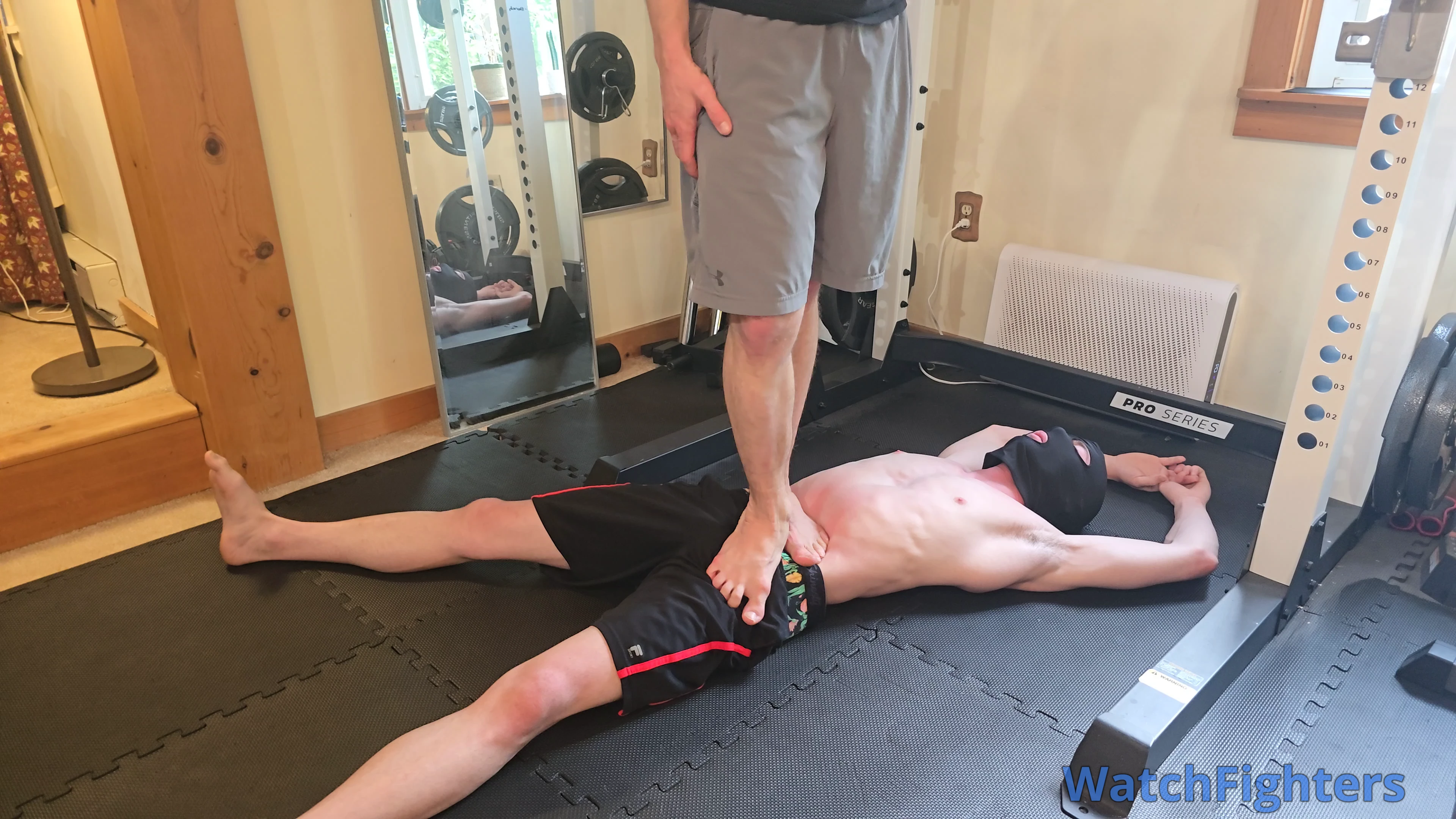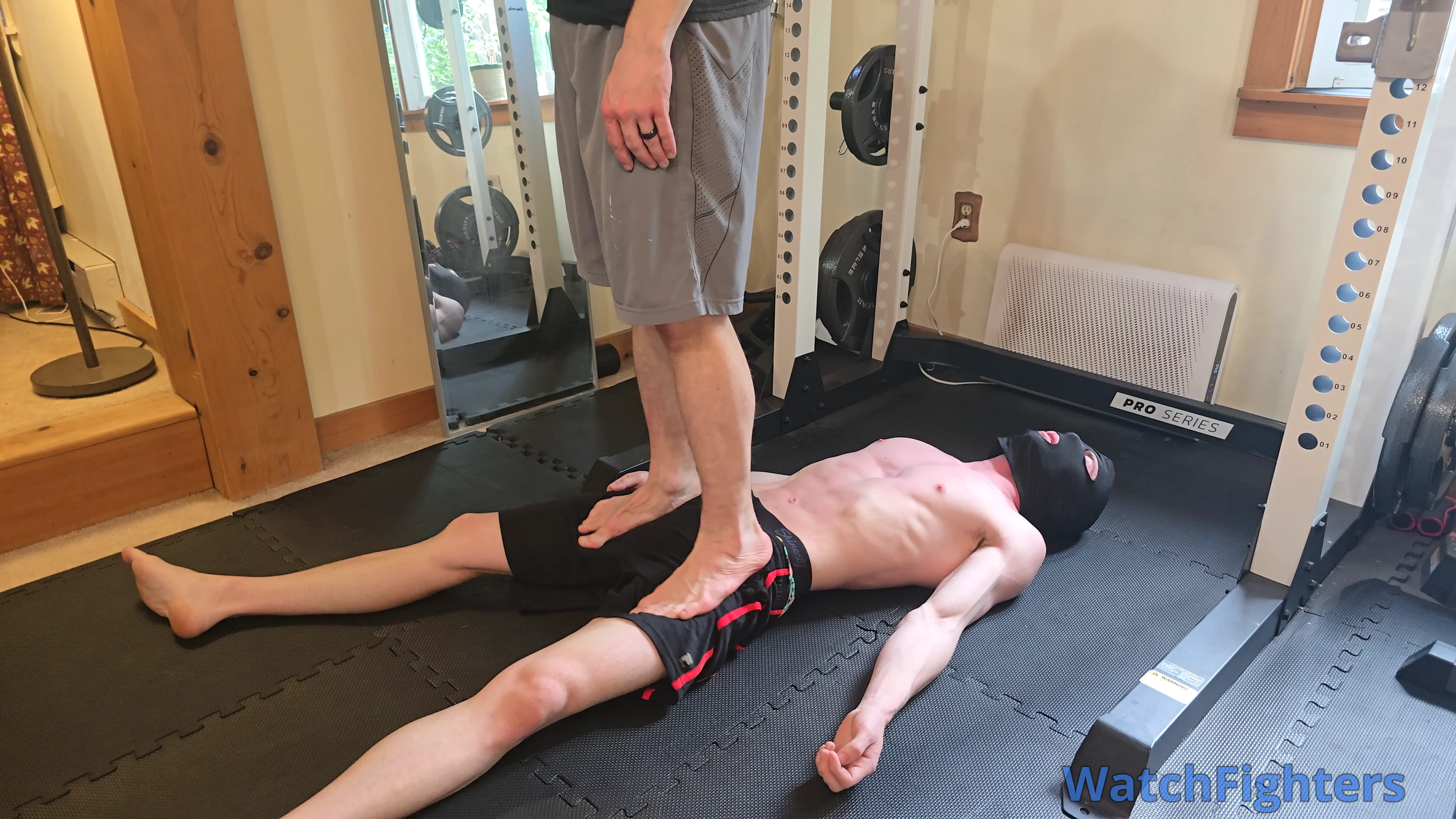 This video is 9 minutes of barefoot stomach and chest trampling. So many jumps I lost count. My trampler also hung from the power rack and dropped almost 4 to 5 feet onto my abs at least twice. I was struggling by the end so I was given a reprieve to smell my master's feet while he sat on me and played on his phone. Lots of ab pressing and cock stomping. This 9 minutes was about 2 minutes after the other video called "Bound and Punched," so I was already worn out from that. This was a tough one. Enjoy!!