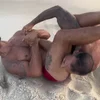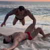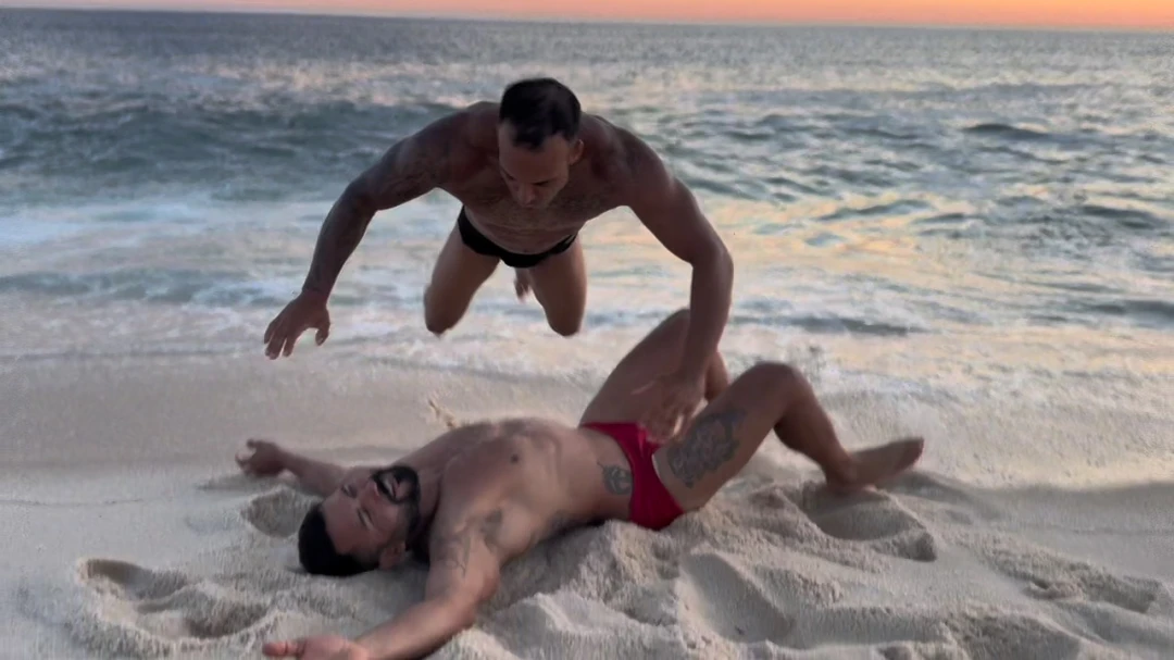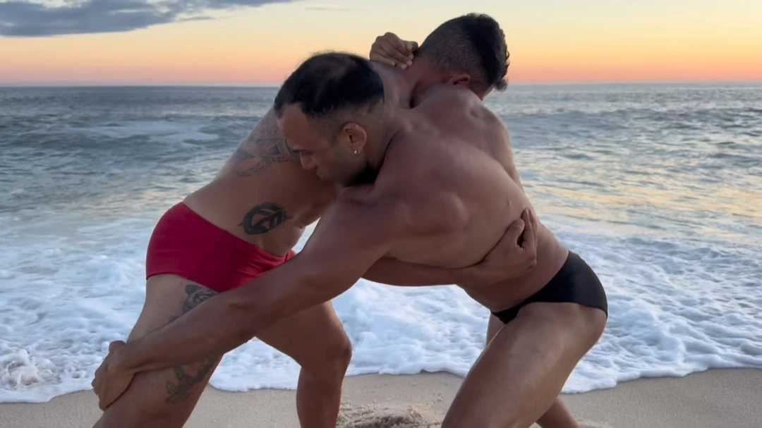 Two powerful fighters collide by the sea in an intense beachside showdown of strength and dominance.