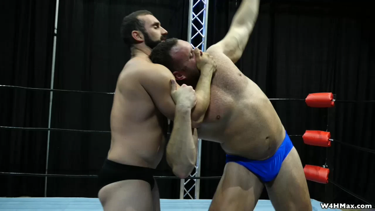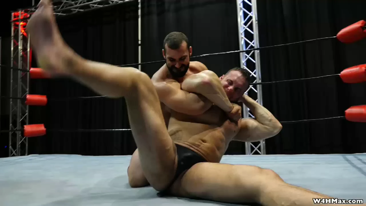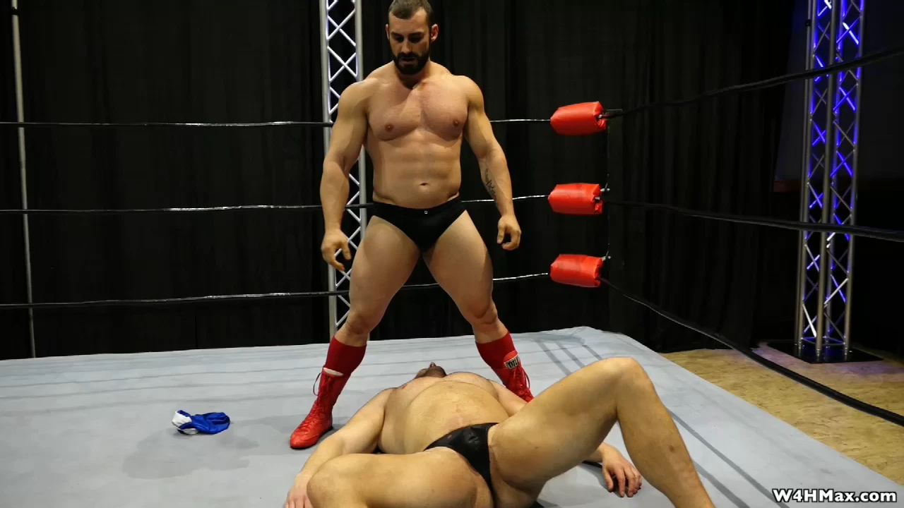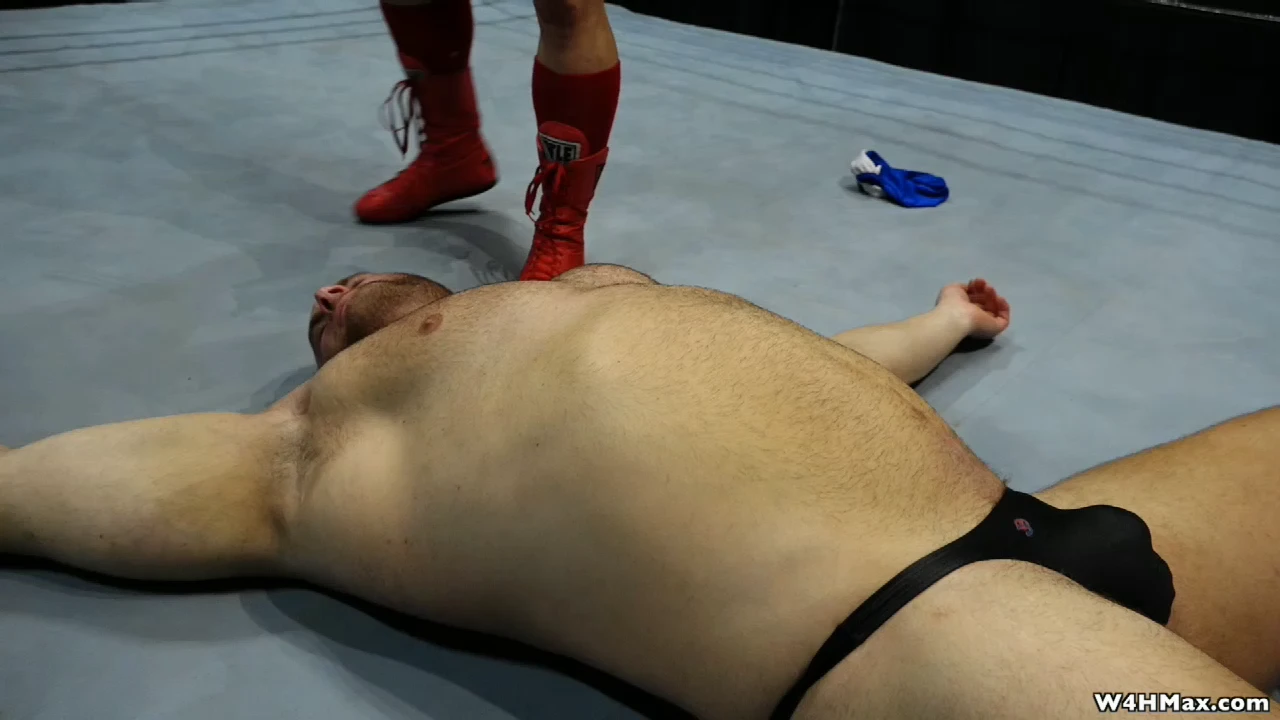 Again and again the bigger dude is knocked out in a total test of endurance and weakness. Wheeler’s almost addicted to the rush that comes with truly feeling the strength rush out of a bigger brawler’s body. Wheeler rolls his victim over, exposing the sensual world of this opponent’s hairy ass crack in humiliating high definition. It’s a sensual game of breath-control between one superior stud and his much bigger plaything.