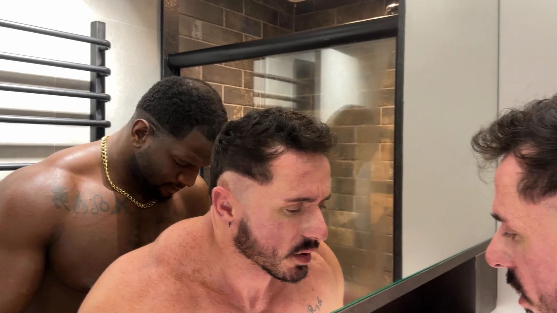 While my friend slept in the other room I took the muscle giant to the bathroom, my friend heard the noise and sneaked to spy.