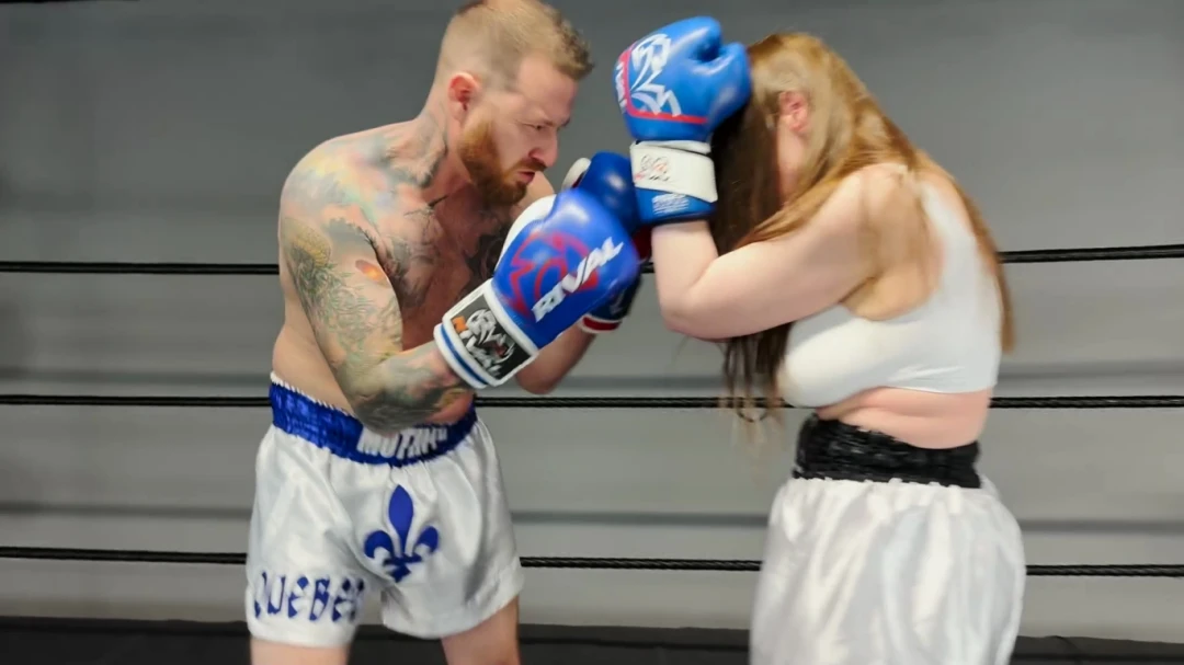 A sequel to the high-impact custom video MB11 "Blow for Blow", featuring a back and forth mixed boxing battle with lots of hard belly punching, clinching, heavy breathing mixed boxing action for 5 rough rounds.The first two rounds of this intense mixed boxing match see rivals Aaron Hummer and Felicia trading solid body blows, neither backing down and both urging the other to go harder and see who has the tougher and more durable abs.In round 3, we start seeing quick and sharp punches to the face, and both our fighters are starting to tire from the punishment over the course of rounds 3 and 4.By round 5, both Felicia and Aaron are exhausted, mouthpieces hanging out, eventually punched out, and breathing heavy. Another grueling match, but this time there's a bit more of a clear winner... until they collapse in exhaustion too! (Spoilers - Aaron wins) Custom mixed boxing script with real belly punching and staged punches to the face.