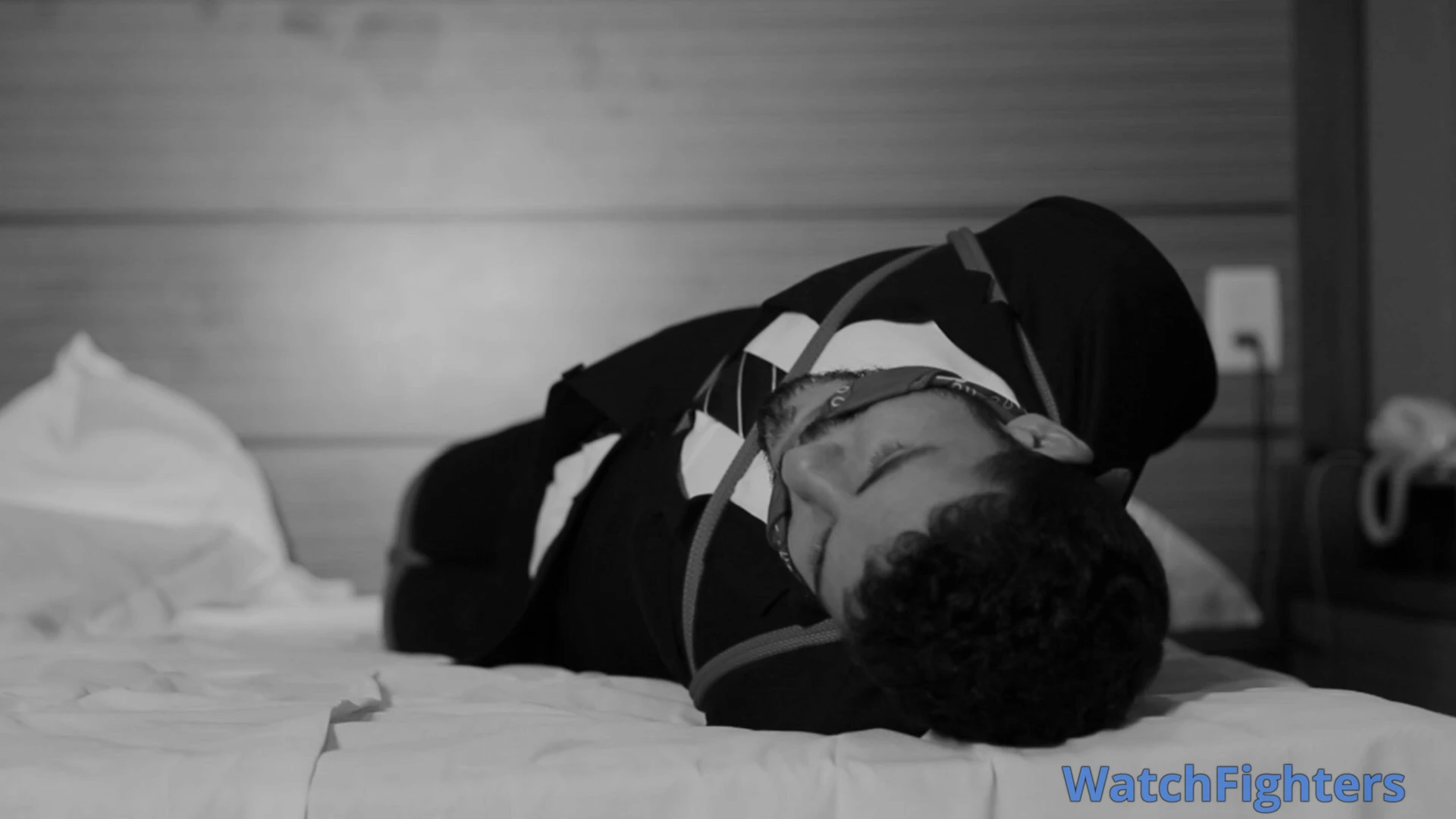 Gagged with a red bandana, Master Bruno prepares André to be bound in a hogtie.