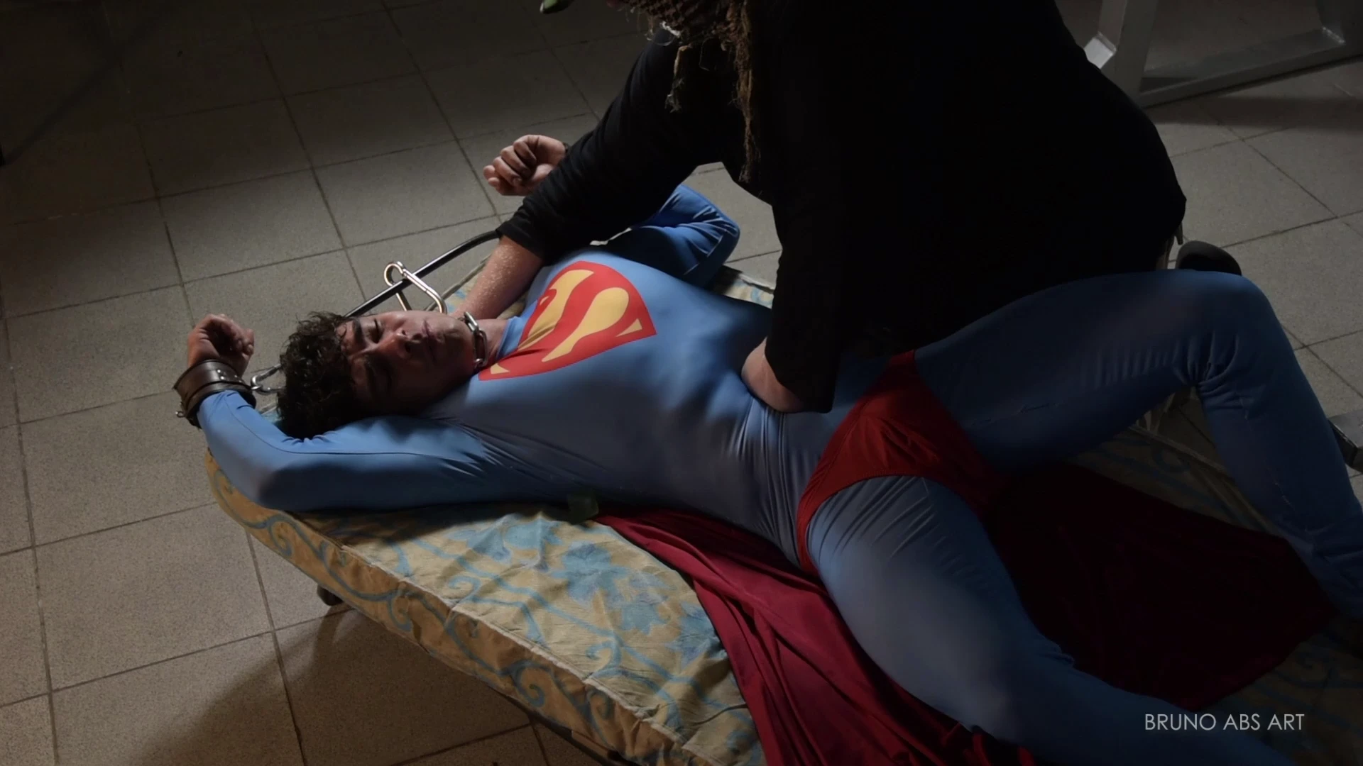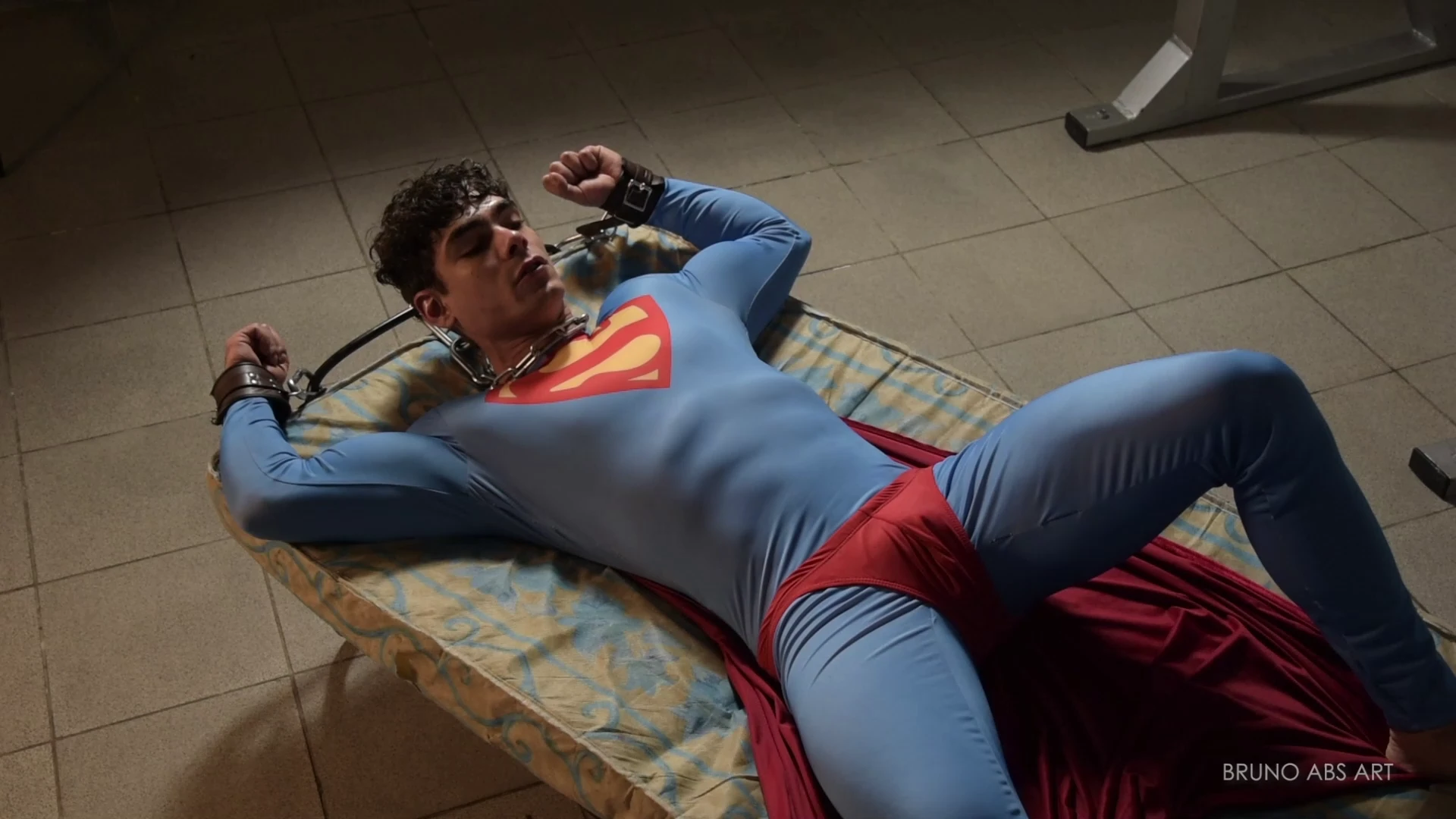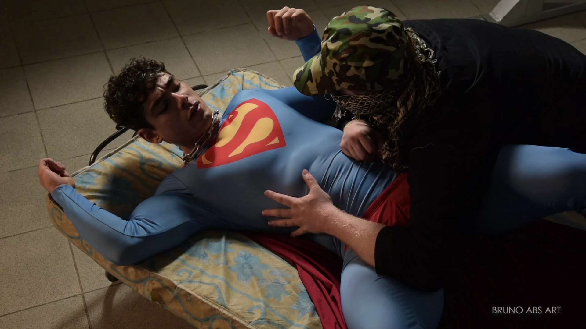 Bruno as super hero in trouble - undressing, gut punch, muscle worship