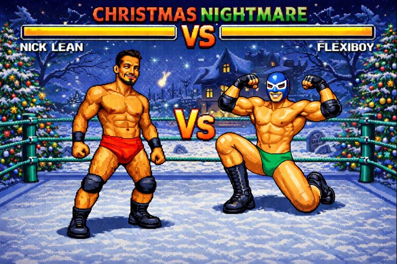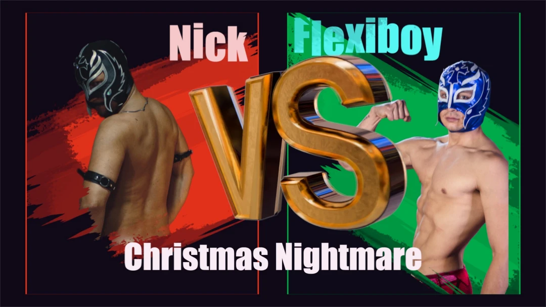 Nick (in red) and Flexiboy (in green) meet in a Christmas-themed encounter that quickly turns tense. A mysterious gift bag sparks Nick’s curiosity, and when he discovers Flexiboy’s new wrestling gear, he decides he wants it for himself. What follows is a physical confrontation where Nick asserts control through visual holds and controlled humiliation. Flexiboy resists, fights back, and narrowly escapes before losing all his gifts. A festive clash with strong visuals and constant tension.