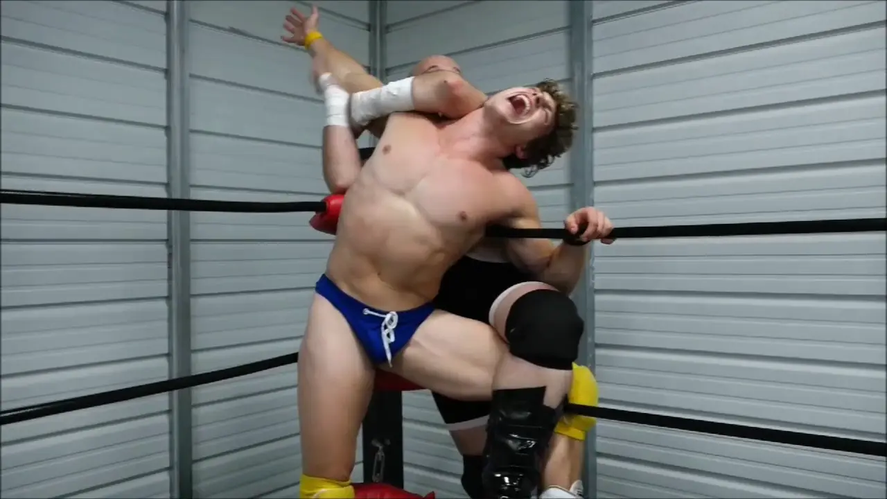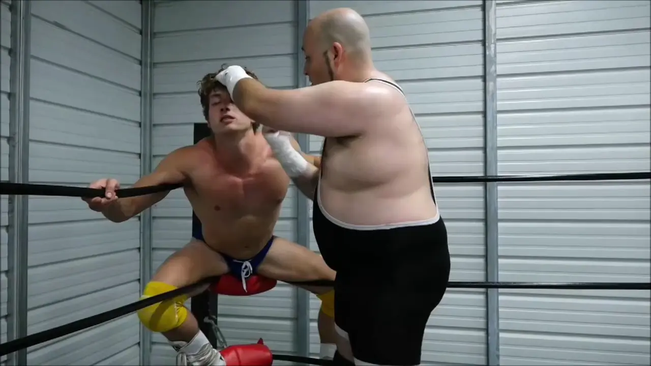 Scrappy spends what seems like an eternity to him tied up in the corner while Donnie uses him as a punching bag. Donnie pulls Scrappy’s trunks so far up his ass that he’ll be singing soprano for several days. The upside is we are treated to numerous views of those gorgeous cakes.