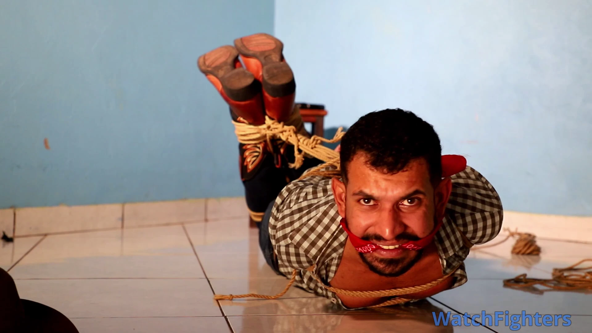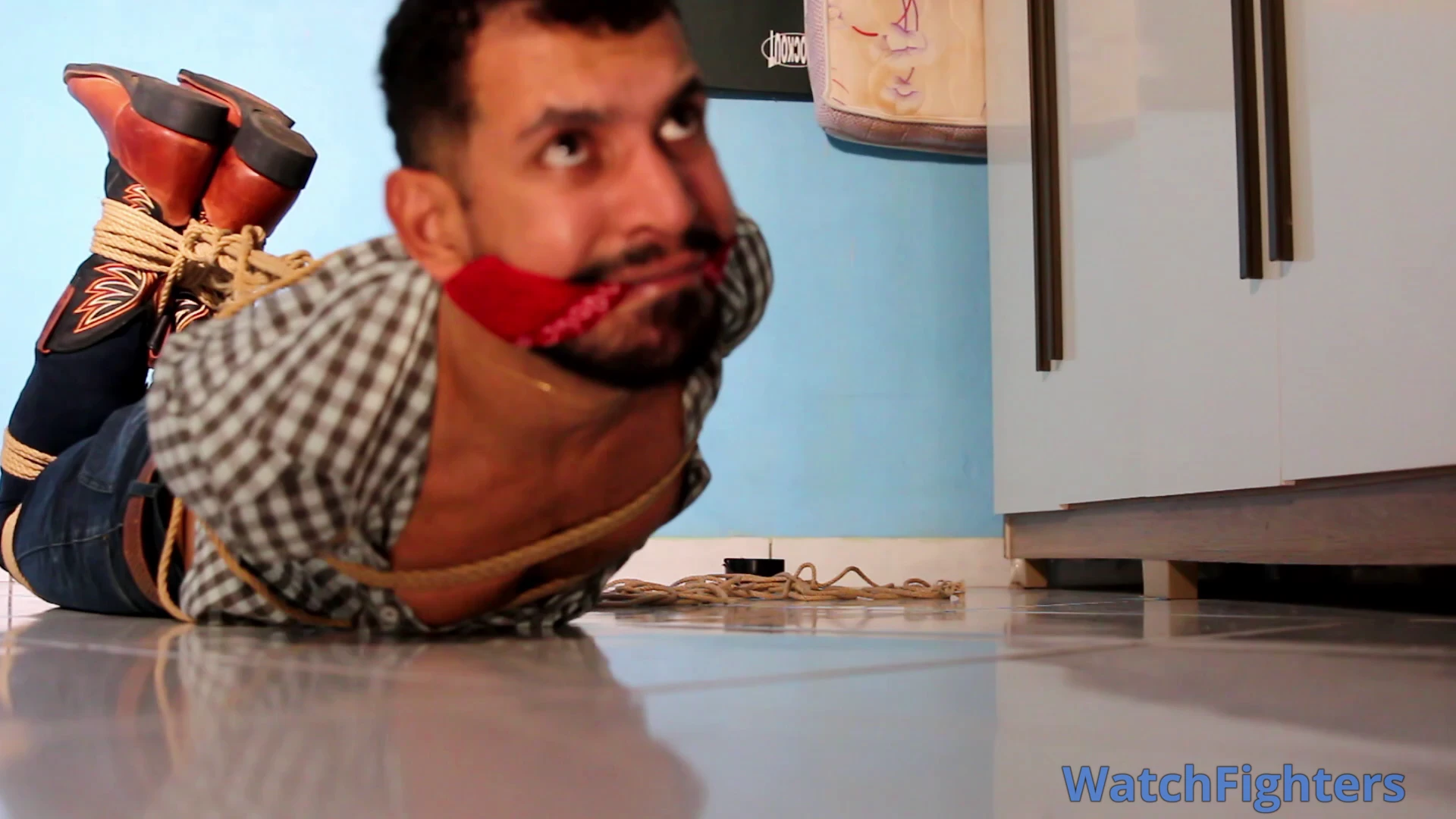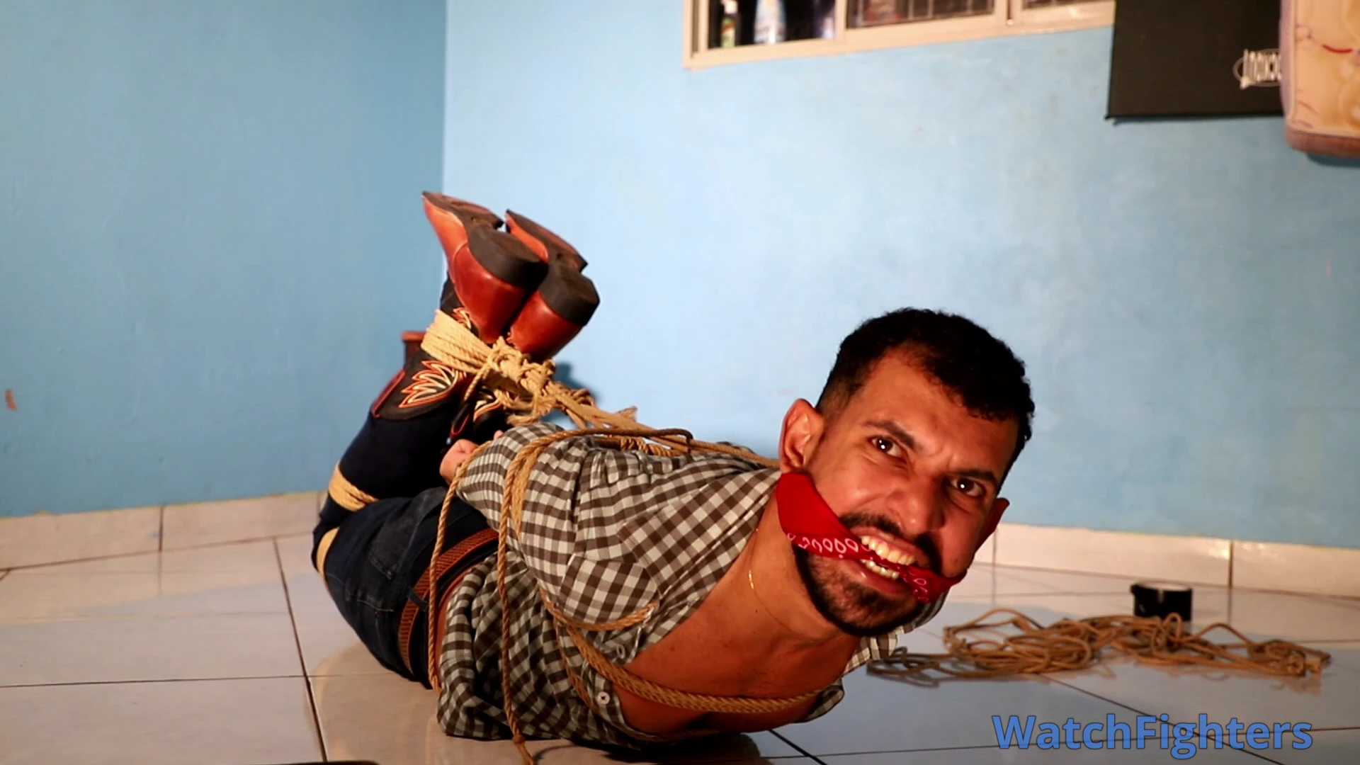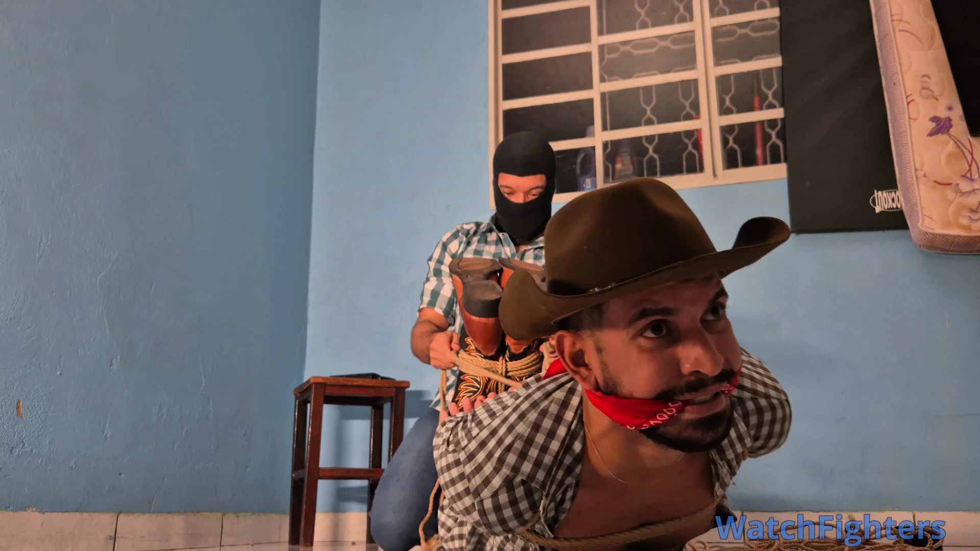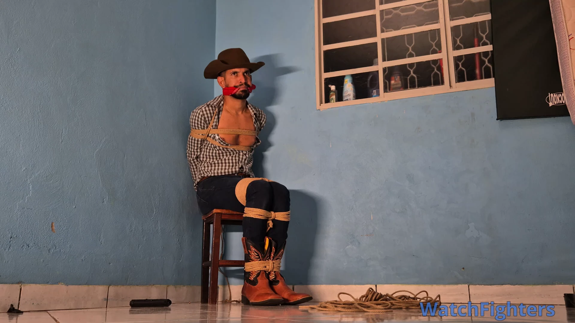 A cowboy named Friitz, after a day of work herding cattle with his companions, is surprised by a hooded man at his ranch. The stranger overpowers him, tying him up with strong ropes and immobilizing him in an extremely tight hogtie. Friitz, with a bandana in his mouth, struggles on the ground, trying to free himself, while facing the tension and danger of the situation.