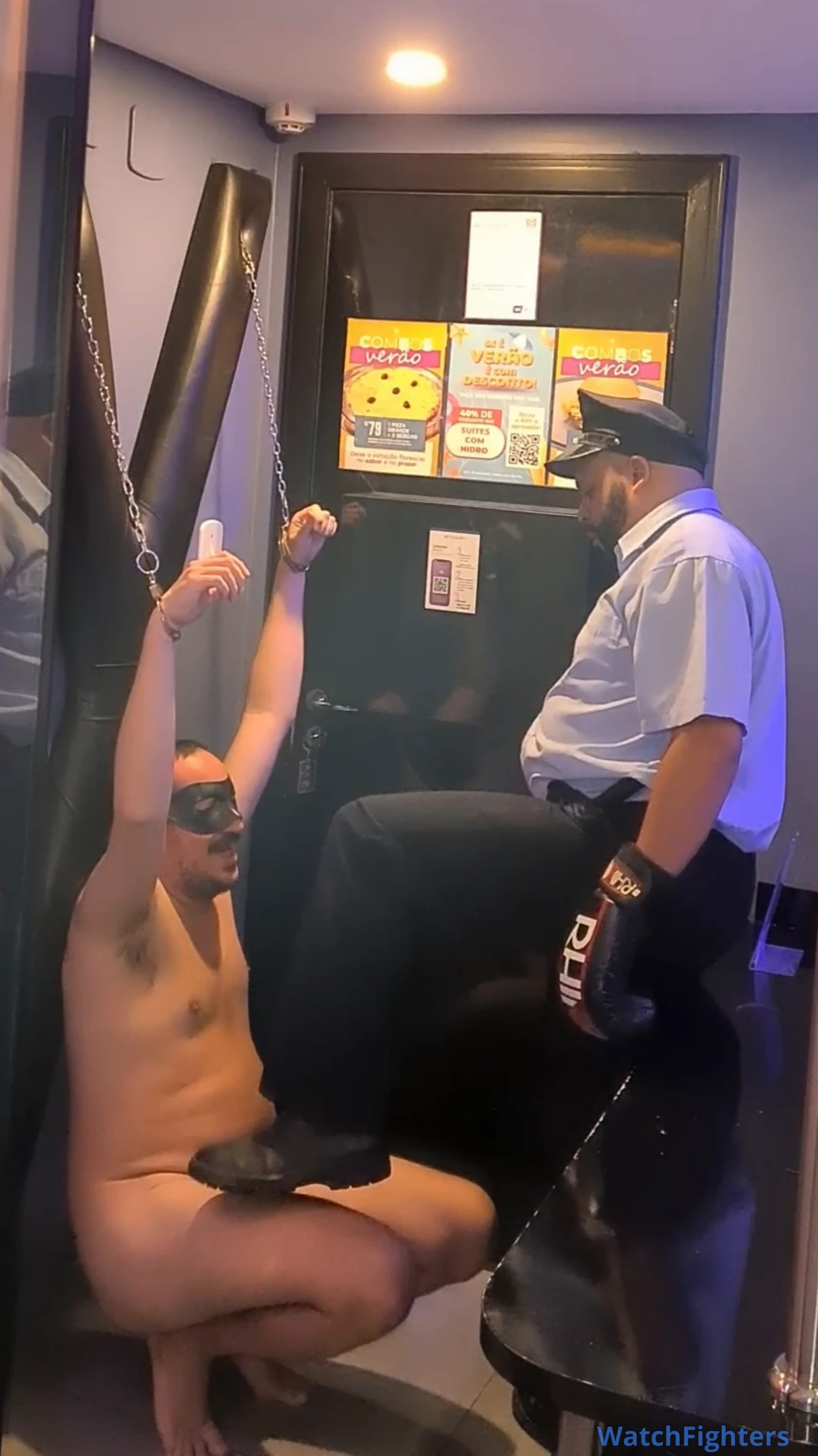 With no resistance possible, the officer decides to test the suspect’s endurance. Wearing boxing gloves, he steps forward and begins delivering controlled gut punches, driving each shot straight into the jobber’s abdomen. Every hit is deliberate, every reaction carefully watched.