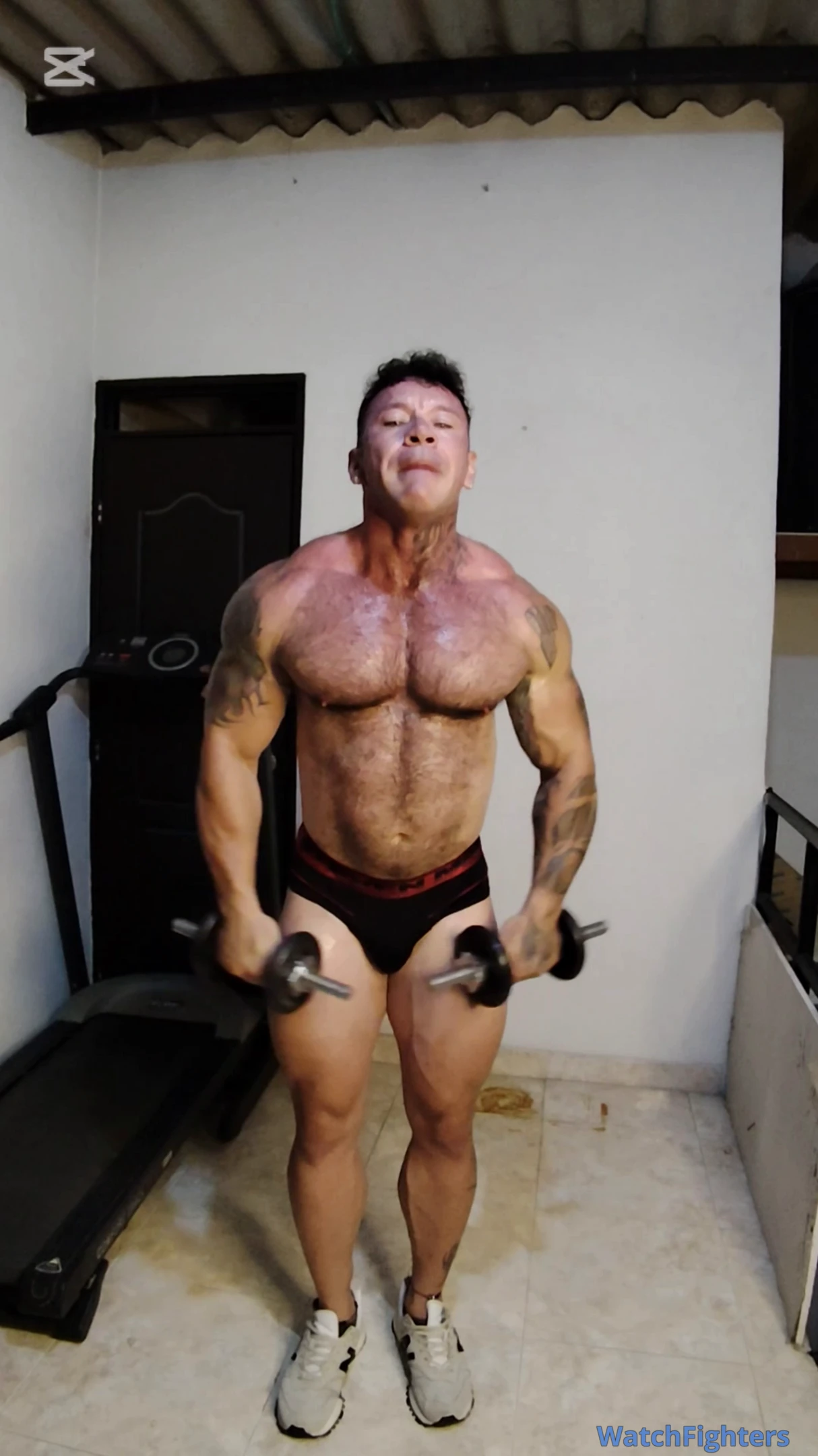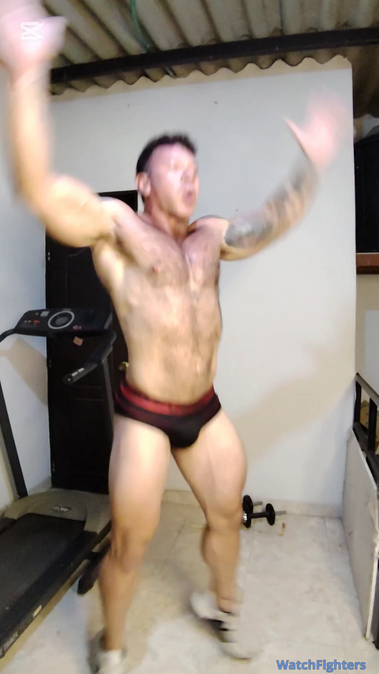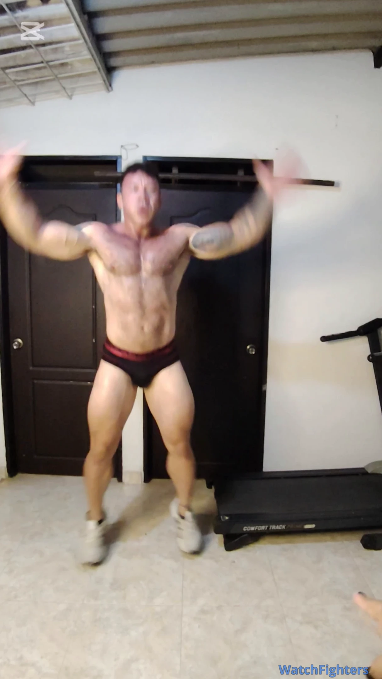Jacobo begins an intense workout routine that includes running on the treadmill, abs exercises, and jumping jacks. As the session progresses, the effort and energy of the training become more noticeable, showing his endurance and determination throughout the workout.