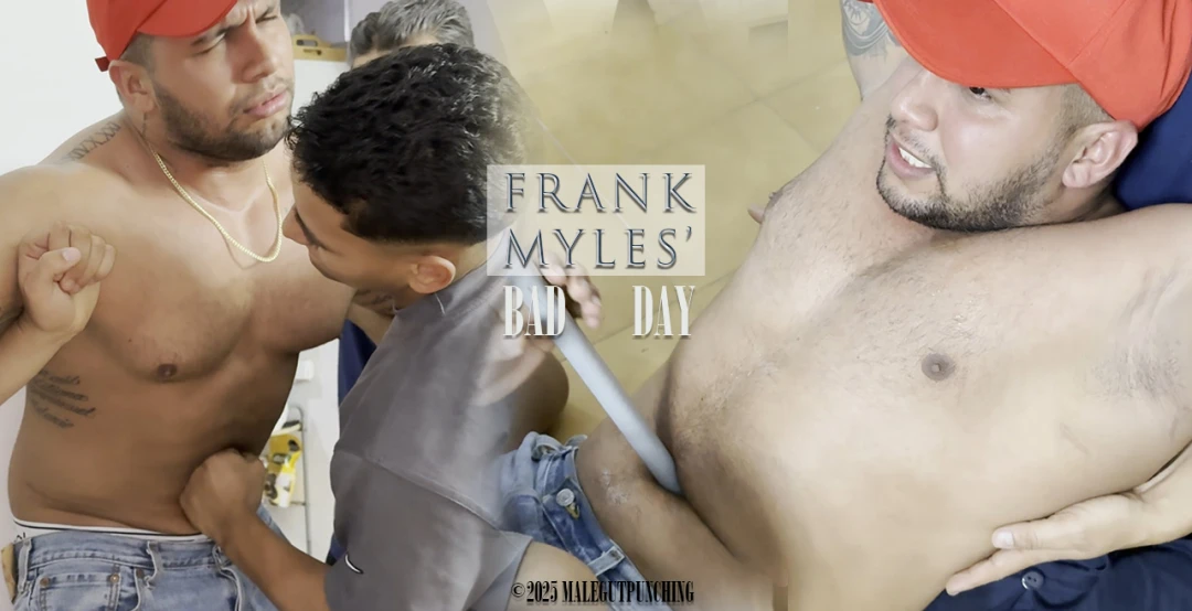 Frank Myles is experiencing an extremely bad day. He is chased by 3 men and cornered. He has to remove his shirt and suffer being kicked in the balls, navel pain, and (of course) intense punches to the gut. He receives some trampling as the men leave him suffering on the floor.