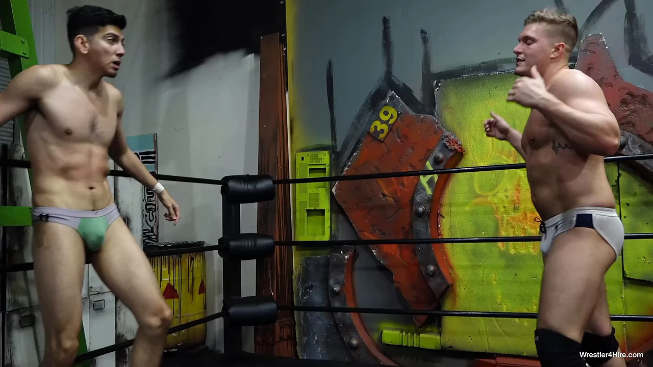 “I’m actually impressed,” says Drew, stripping off his jacket. Drew hoists Paricutin up by his legs, displaying his ass to the camera in a humiliating hold. Superior thighs squeeze the skinny rookie, leaving him breathless as the camera explores Paricutin’s taint with an eye for humiliation. Drew challenges Paricutin to an arm wrestling contest that the skinny man valiantly fights to win, only to be knocked over on his back by the big brawler.