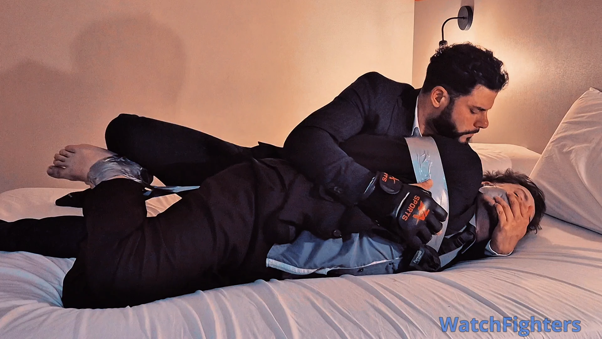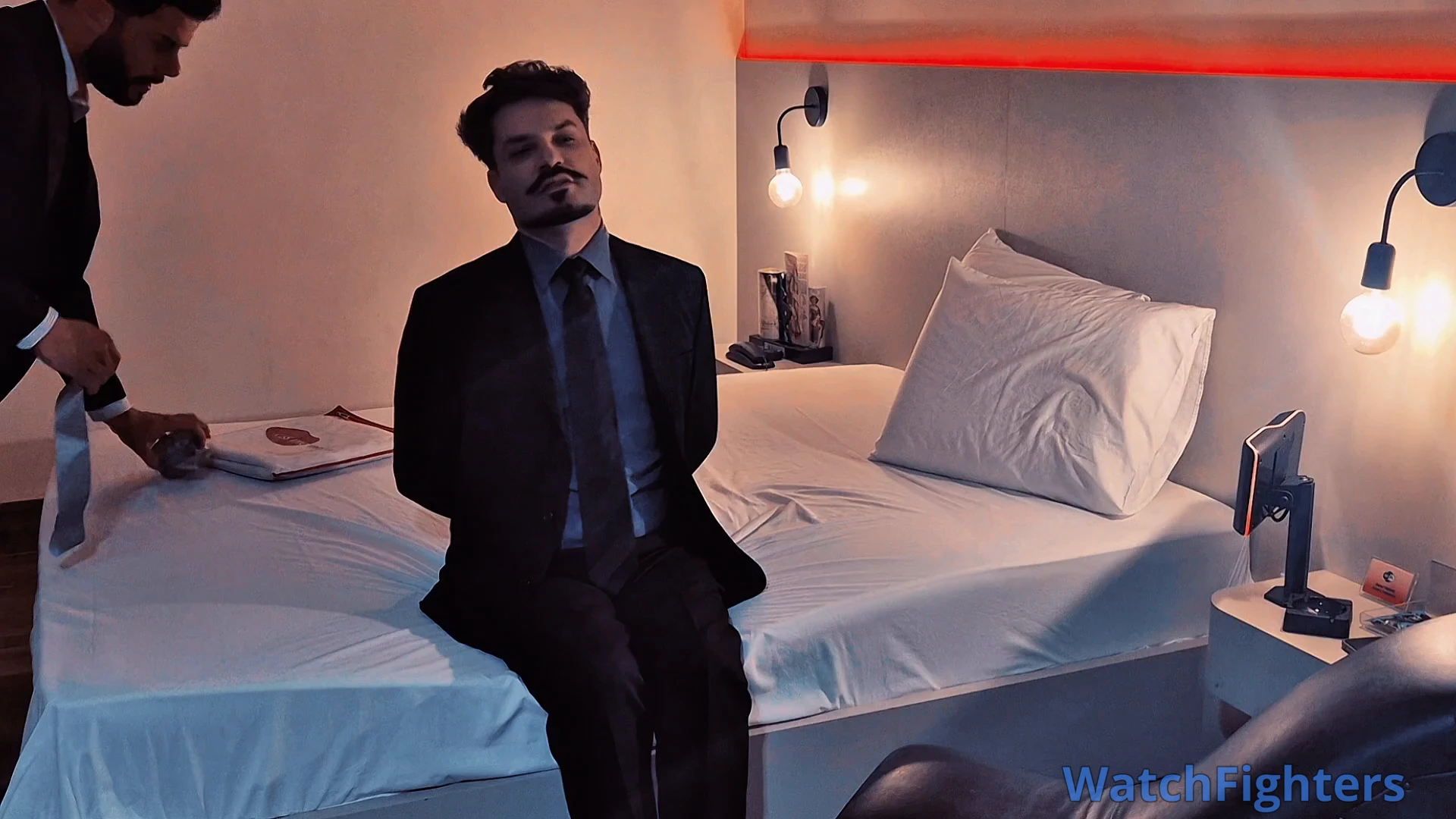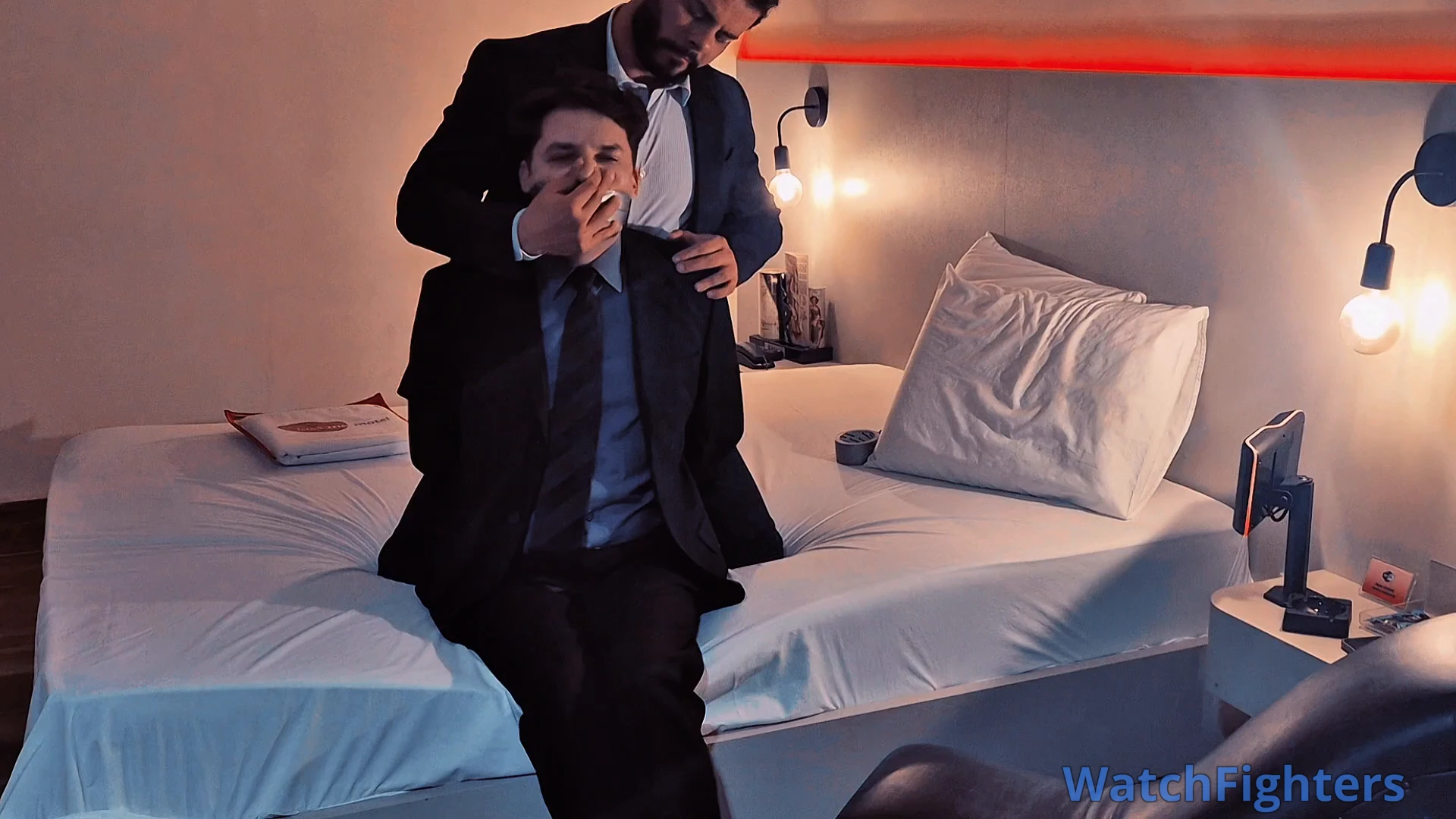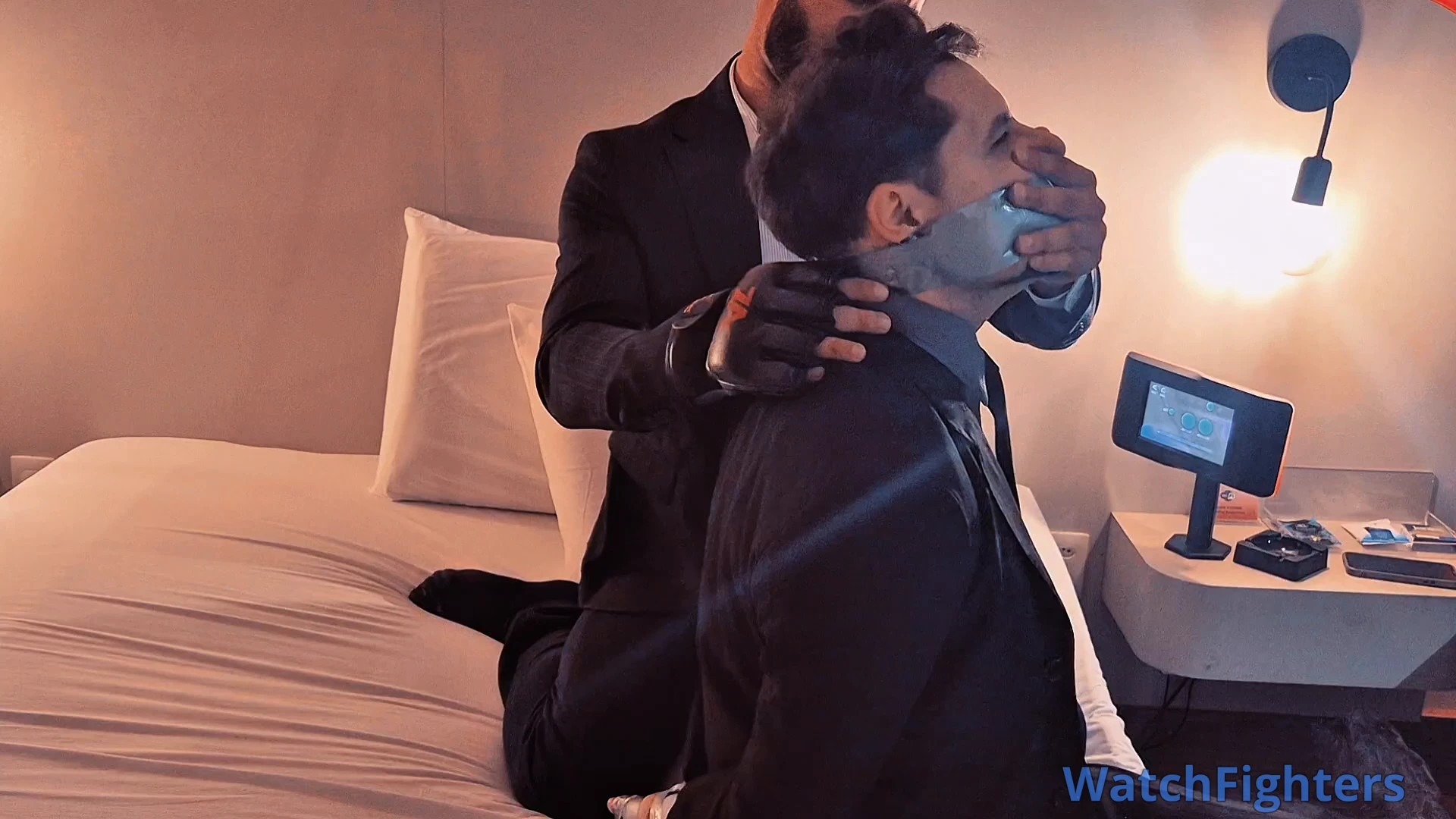 Managers Tonny and Andrew decided to meet at a motel to explore some fetishes. Andrew began dominating Tonny, both in suits and ties, tying their hands with duct tape and using hand gags. Andrew decided to try a leather wrestling glove on Tonny, practicing chokehold play and hand gags. Things continued intensely, with Andrew tying him up with more tape, performing arm locks, tight hugs, stomping, pig-shaped restraints, and much more.