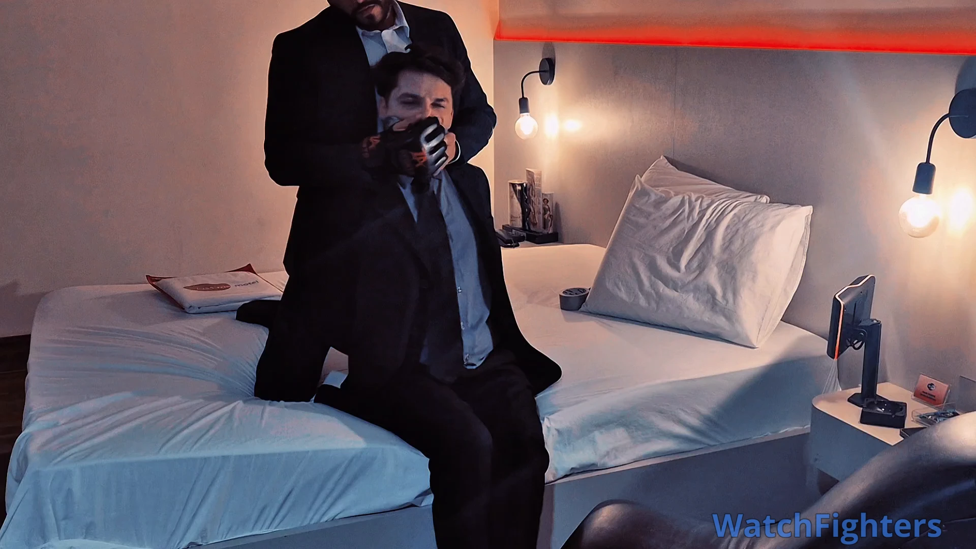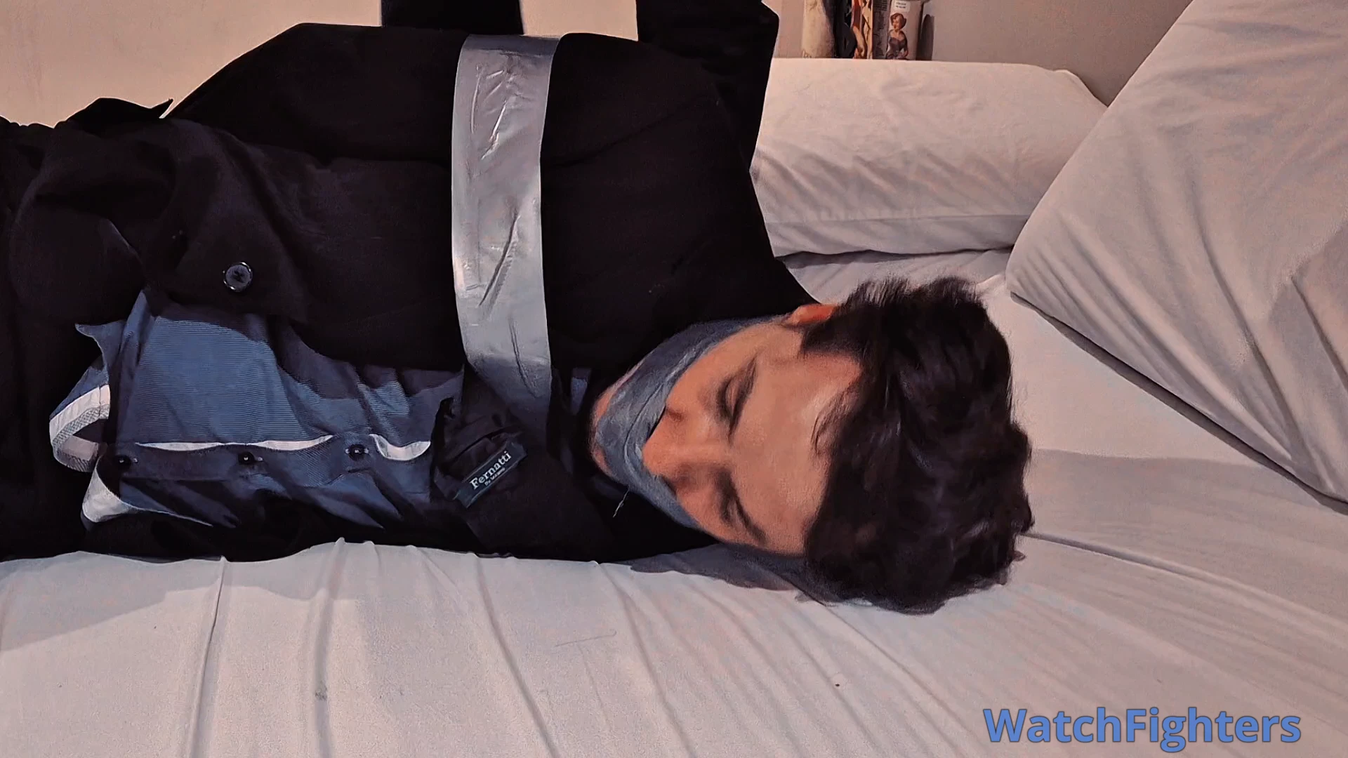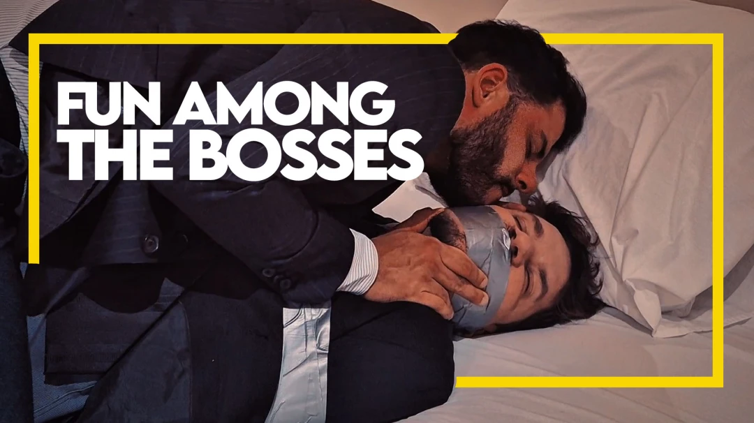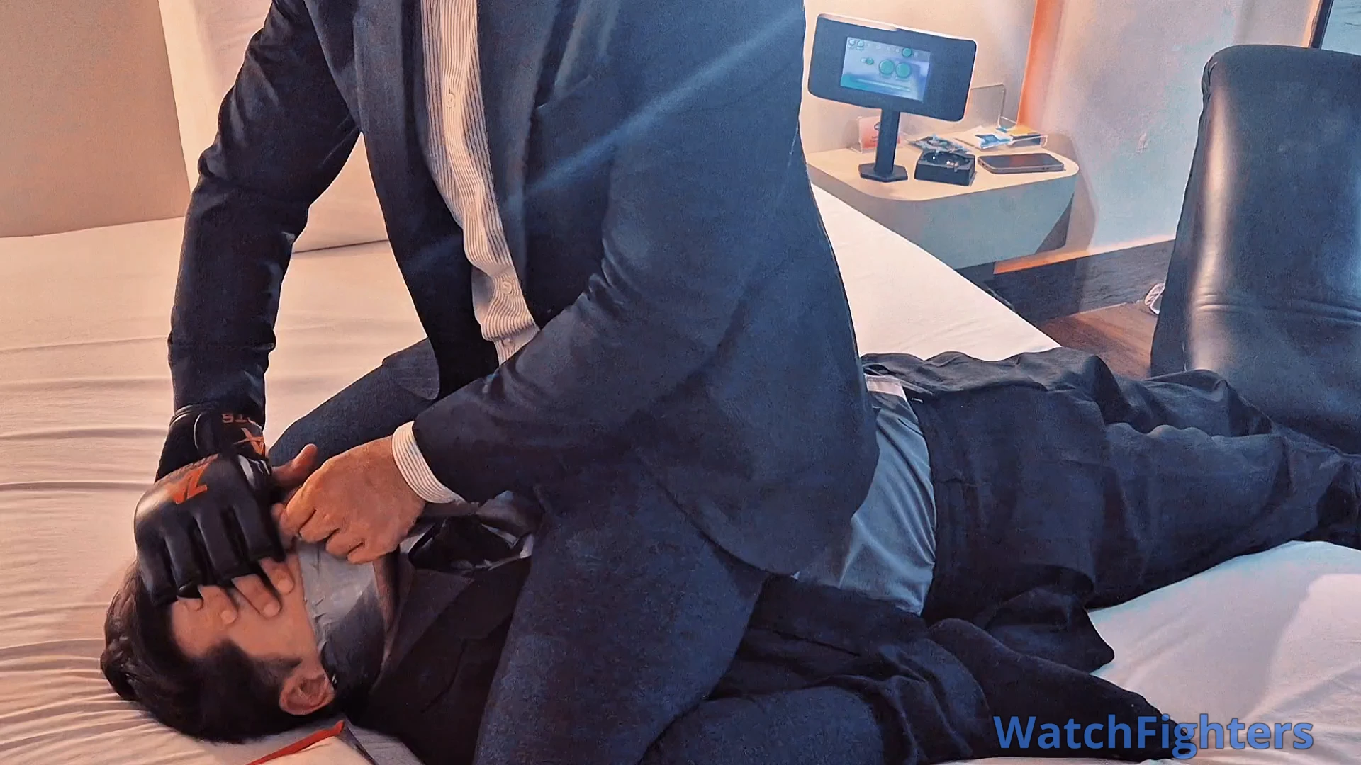 Managers Tonny and Andrew decided to meet at a motel to explore some fetishes. Andrew began dominating Tonny, both in suits and ties, tying their hands with duct tape and using hand gags. Andrew decided to try a leather wrestling glove on Tonny, practicing chokehold play and hand gags. Things continued intensely, with Andrew tying him up with more tape, performing arm locks, tight hugs, stomping, pig-shaped restraints, and much more.