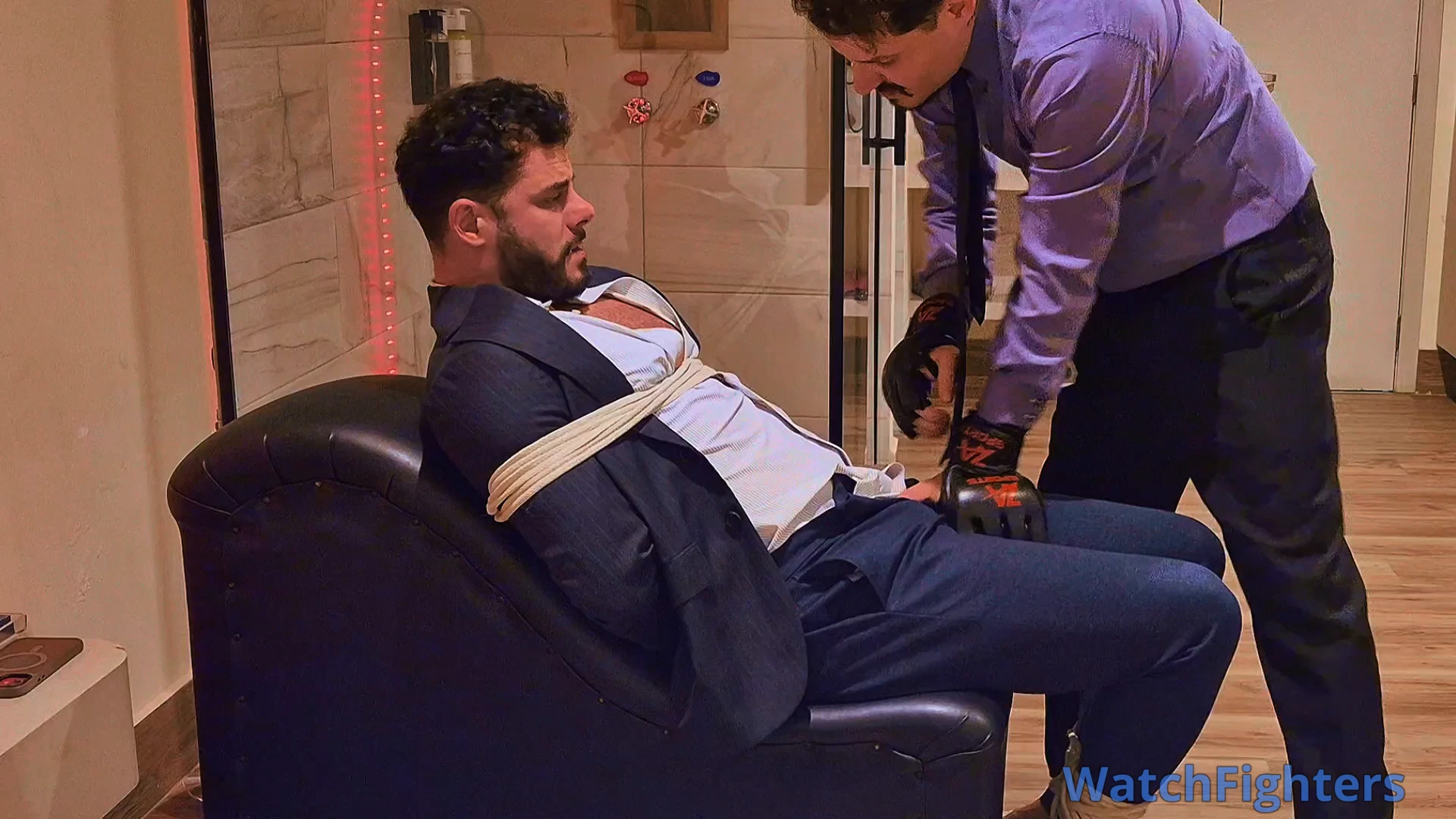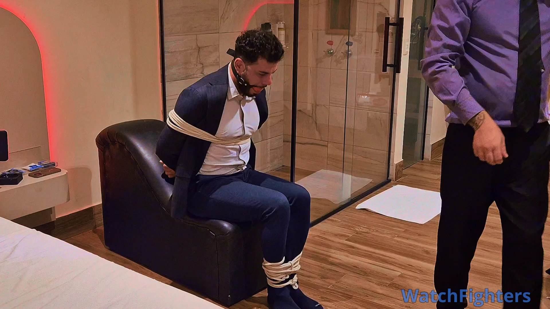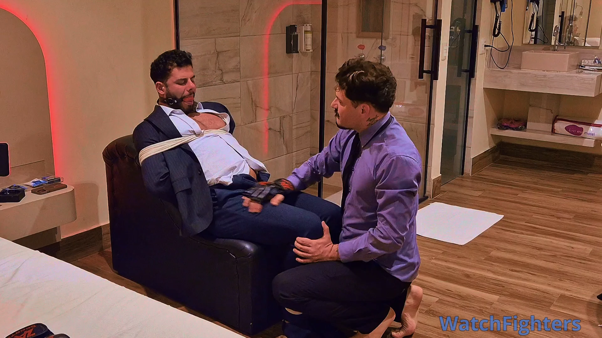 Managers Tonny and Andrew decided to meet at a motel to explore some fetishes. Now it was Andrew's turn to be dominated by Tonny, who tied him to a leather armchair with white ropes and gagged him with a ball gag. Tonny then put on Andrew's training gloves and delivered several punches to Andrew's chest and stomach, in addition to hand gag and breath play. Tonny opened Andrew's shirt, exposing his muscular chest, and finished with more punches, hand gag, and breath play.
