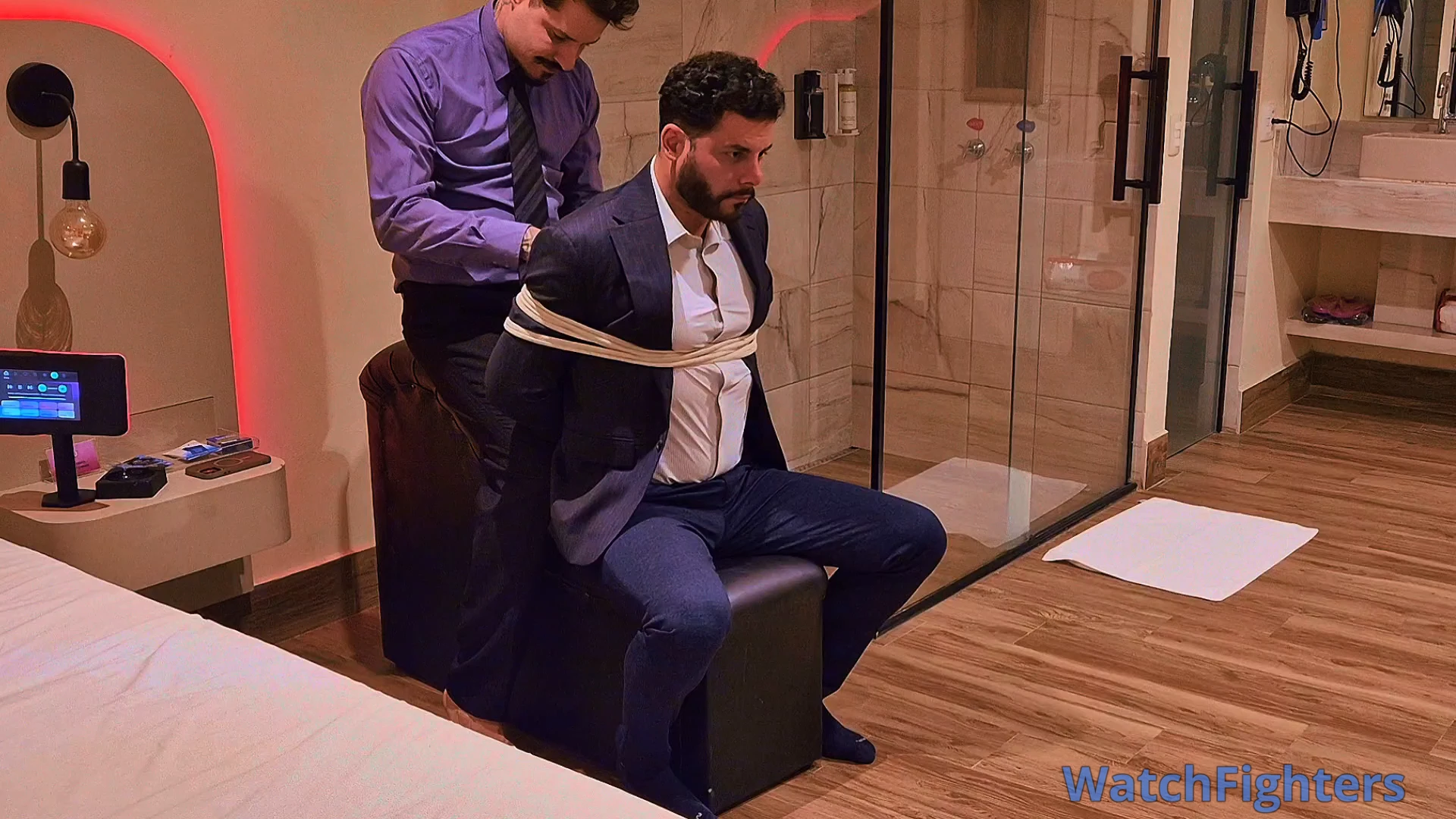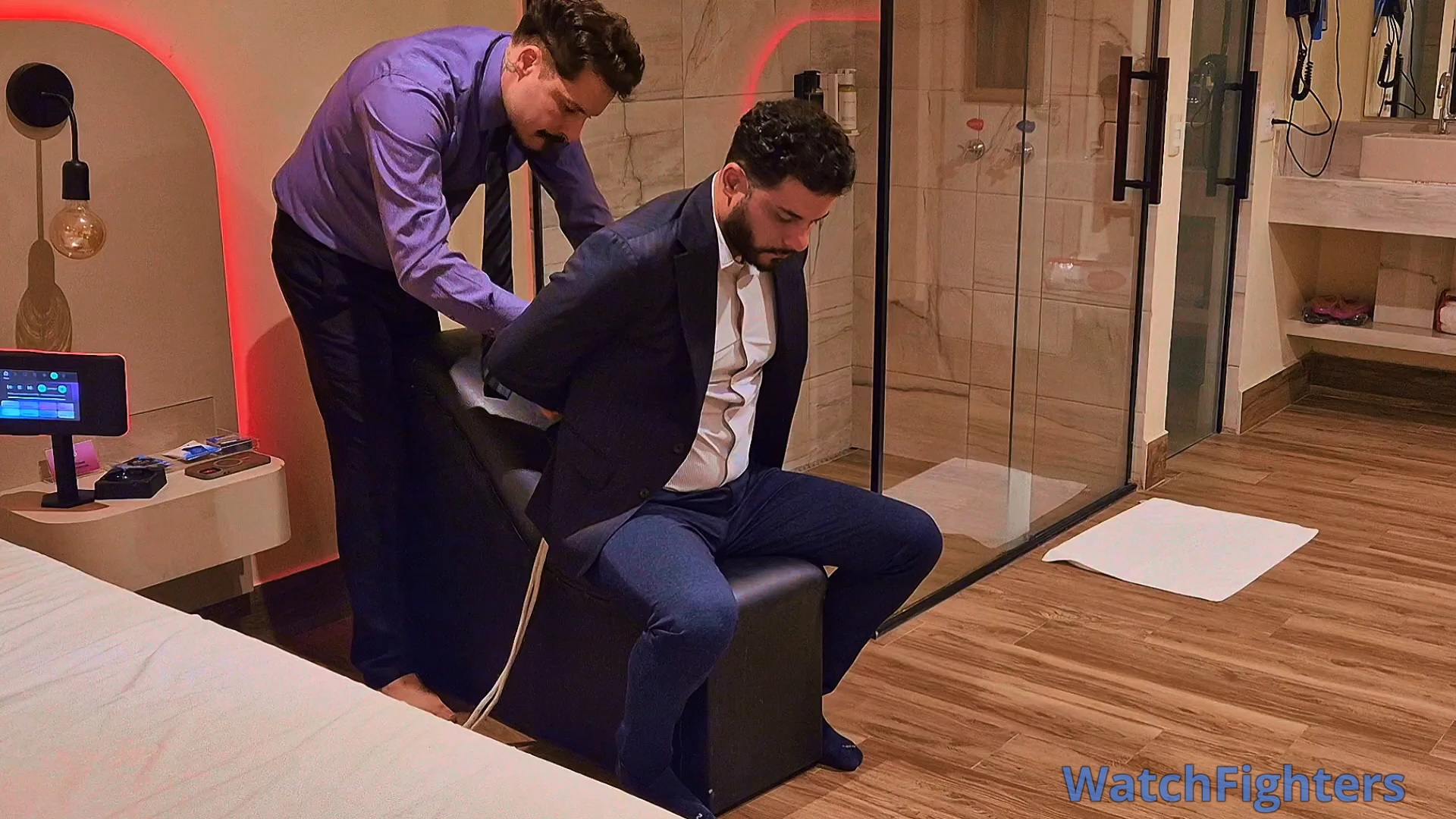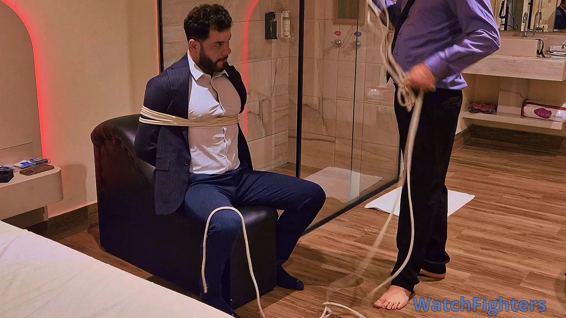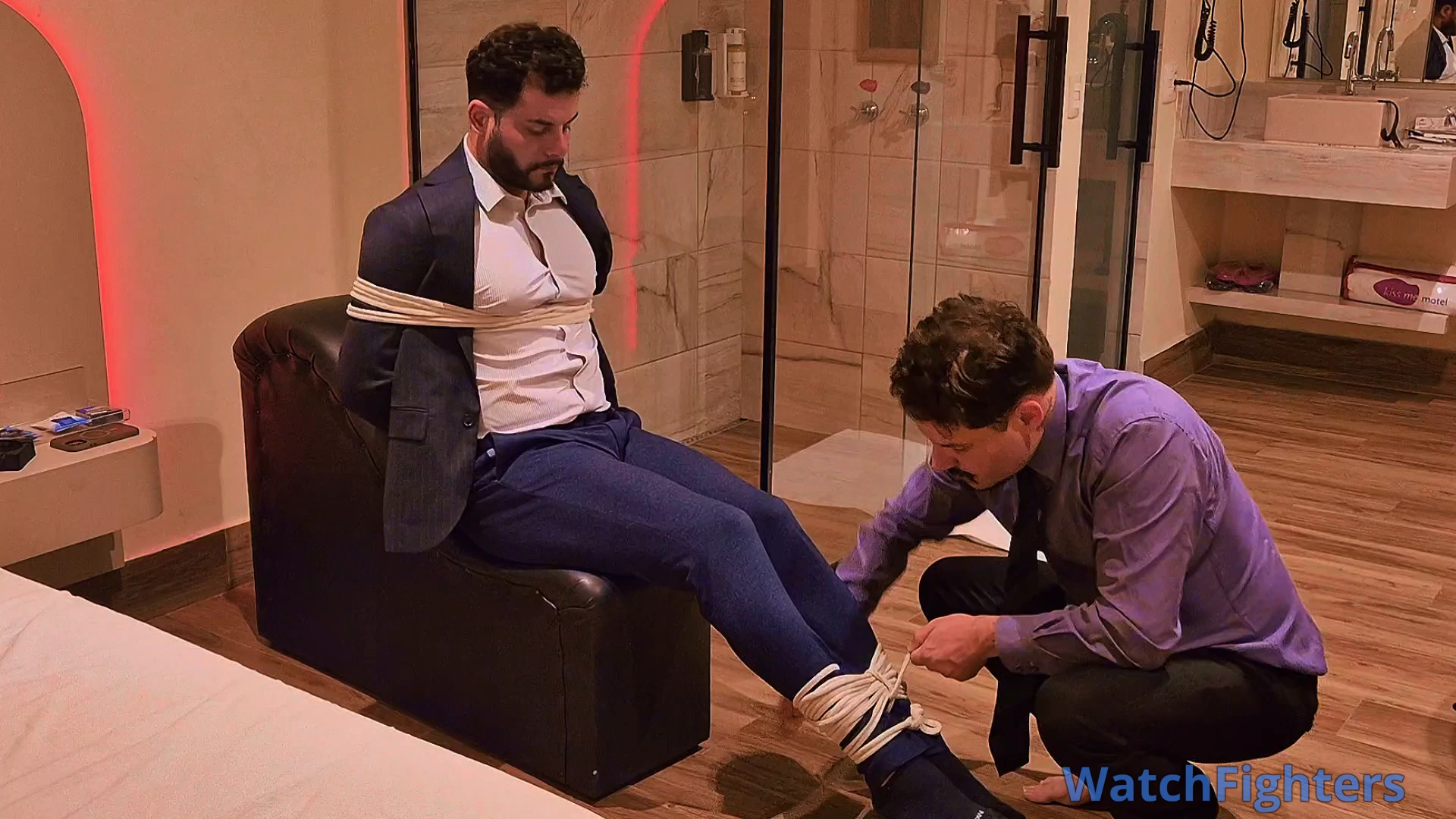 Managers Tonny and Andrew decided to meet at a motel to explore some fetishes. Now it was Andrew's turn to be dominated by Tonny, who tied him to a leather armchair with white ropes and gagged him with a ball gag. Tonny then put on Andrew's training gloves and delivered several punches to Andrew's chest and stomach, in addition to hand gag and breath play. Tonny opened Andrew's shirt, exposing his muscular chest, and finished with more punches, hand gag, and breath play.