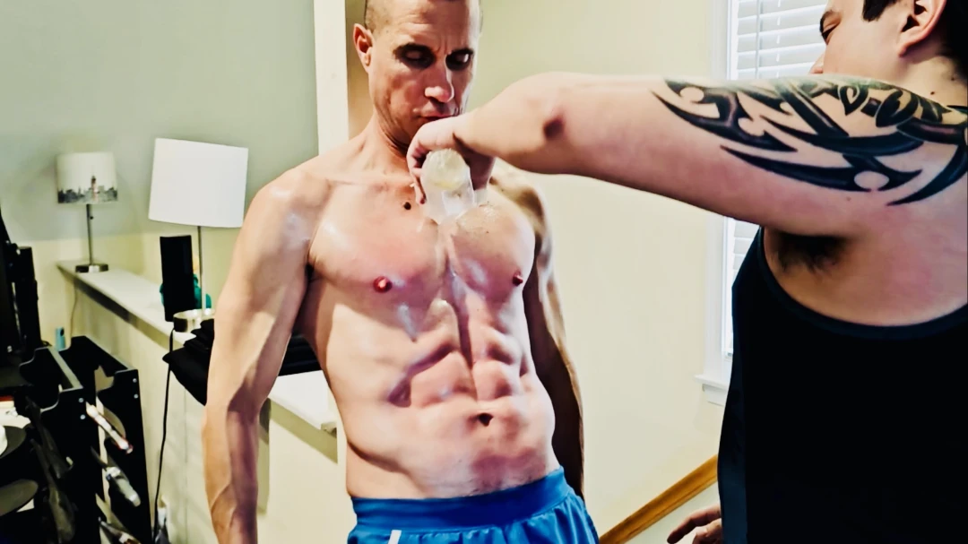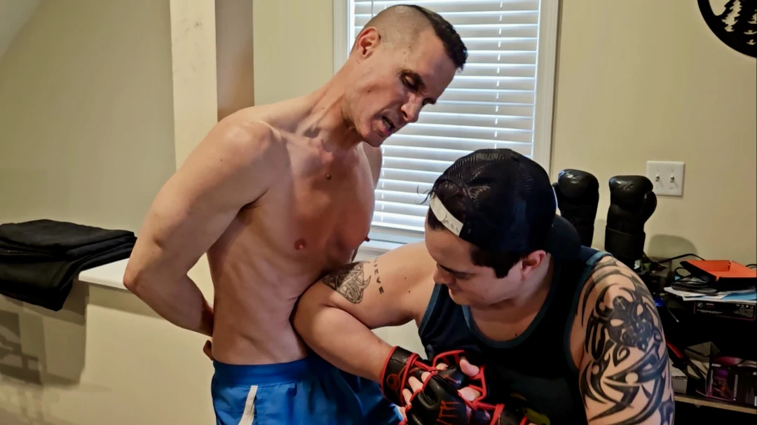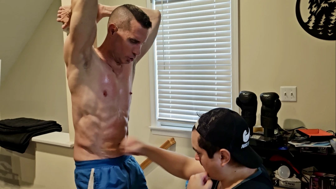 - Ash pummeling and elbowing Devon's absolutely shredded abs, obliques and pecs with both MMA gloves and bare fists as Devon stands leaning against a post.