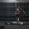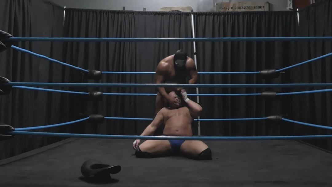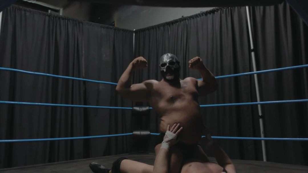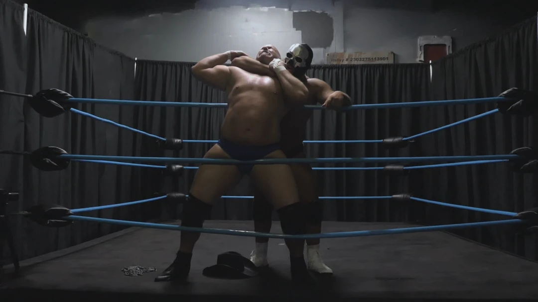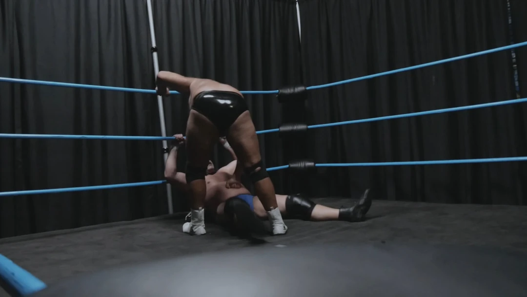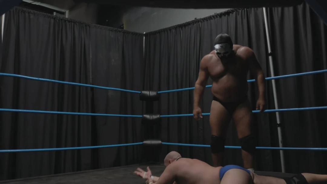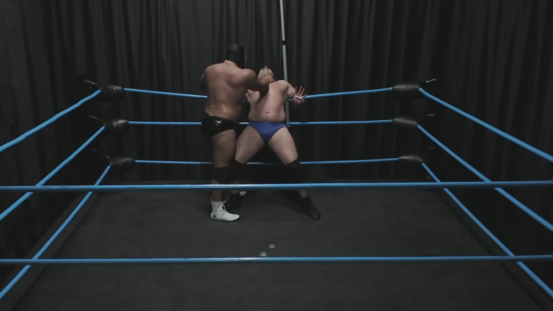 Gasping for breath and barely able to stand, Hevy foolishly attempts a headbutt. A loud clang rings out as he collides with the solid skull hiding Goliath's face. Laughing as Hoss drops to his knees in pain, Goliath rears back and delivers a headbutt of his own, then again. A third drops Hevy to his back once more. Draped across the ring post again, Goliath let's his fists fly, then tramples and stomps his fallen foe's hand.