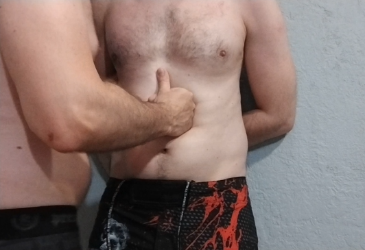 Dude is punching my gut with my arms over head and against a wall, than tiedes me up and continue the beating. In the second part my gutpunching-bro delivering gutpunches to my helpless abs while I'm lying on the couch.