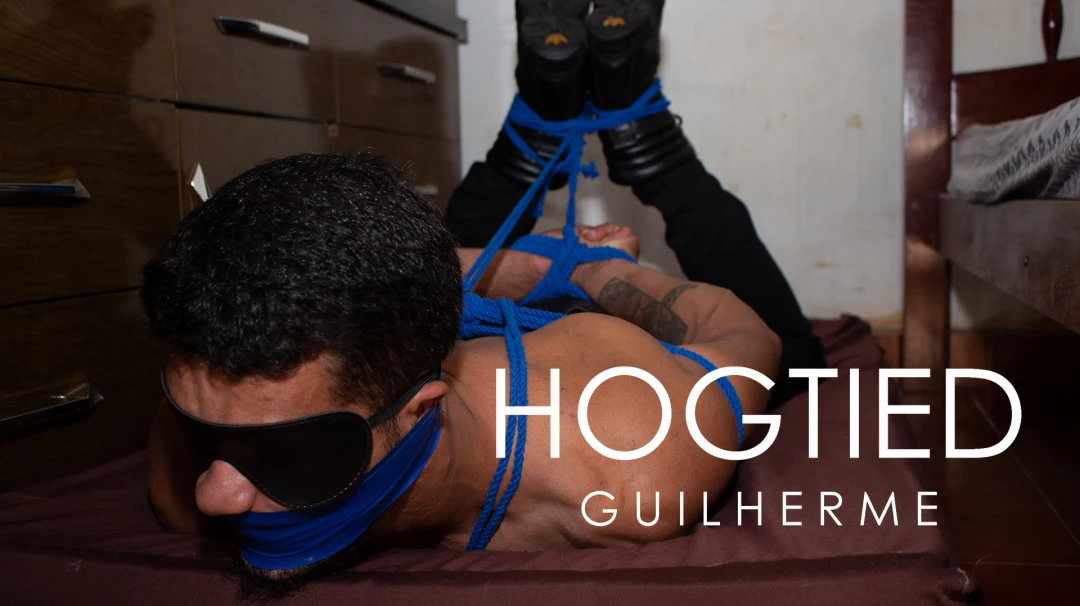 In an intense bondage experience, Gui, a striking 6'1" man, finds himself fully restrained in a hogtie. Gagged with blue tape, he wears tight black pants and military boots that heighten the visual appeal. This film is a treat for bondage enthusiasts, showcasing Gui's strength and vulnerability in a scene filled with tension and captivating aesthetics.