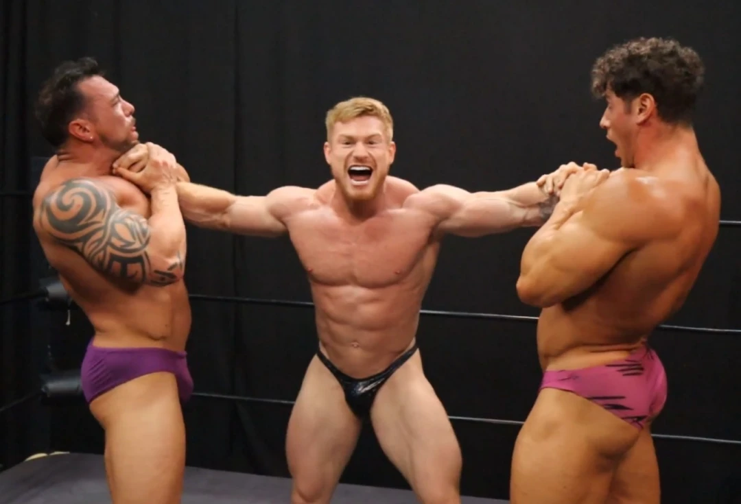 Johnny takes things outside the ring and that's when Neo appears. Still clad in his sparkly black posing bikini, he mockingly claps and remarks to his unseen 'father' that these 'specimens' are acceptable. Johnny and Tyson object to being called specimens and decide to "kick his ass."