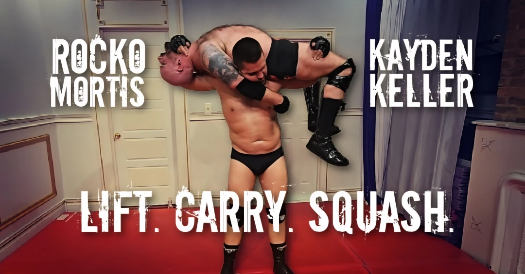 It's been nearly two years since ROCKO MORTIS took a humiliating early-career beating from the one and only KAYDEN KELLER. But Rocko's no rookie anymore. Now, with plenty of experience under his belt, he steps up to Kayden and challenges him to a rematch. Unfortunately for him, Kayden has only gotten bigger, stronger, and more powerful on the mats. He puts Rocko through another ringer of degradation and depravity, this time showing off his strength with multiple lift & carry moves. Will this squash match finally convince Rocko he's no match for Kayden, or fuel his fire to one day defeat him?