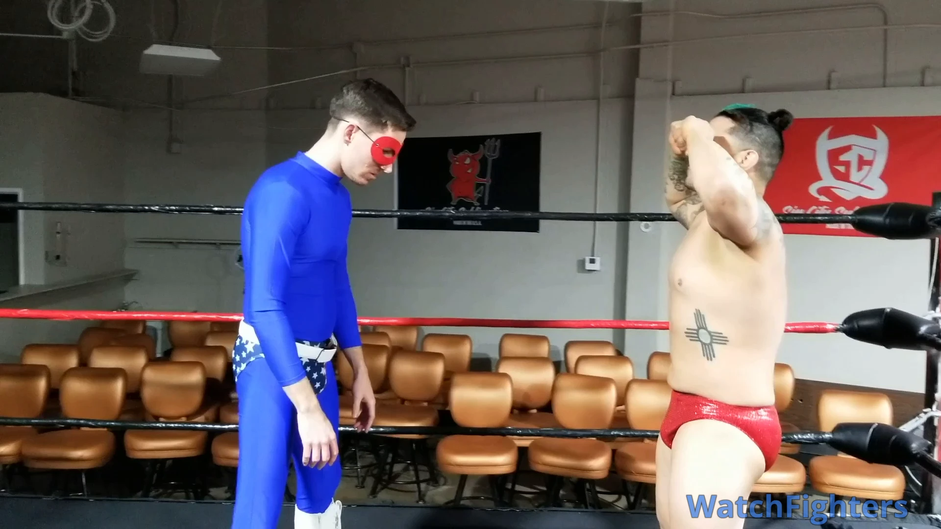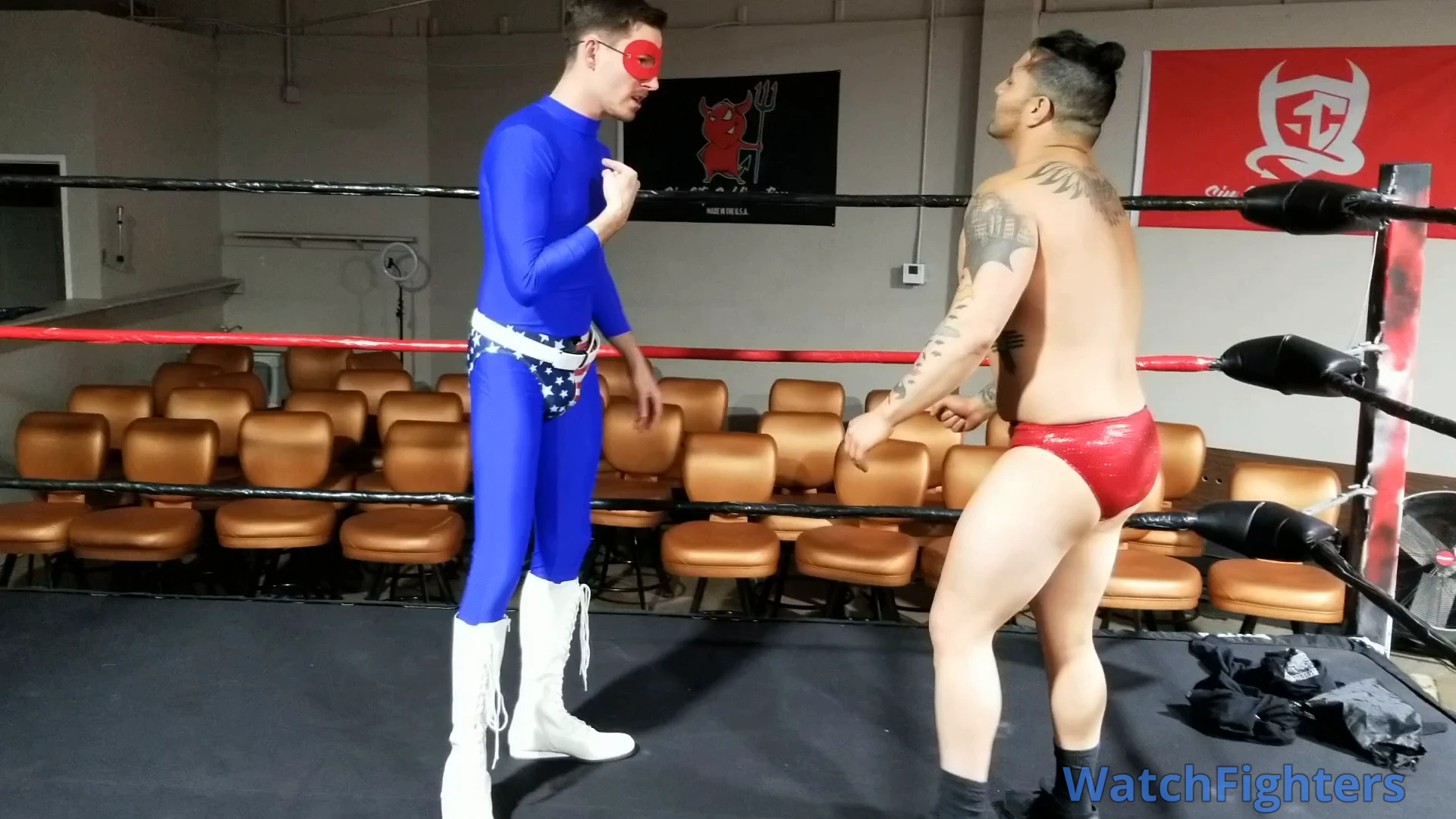 Captain Patriot has arrived to save the day and apprehend Vinnie the Robber! But Vinnie has a trick up his speedo, stripping out of his clothes and seducing Patriot with his gyrating hips and taking advantage of our hero! Who will win? Watch to find out!