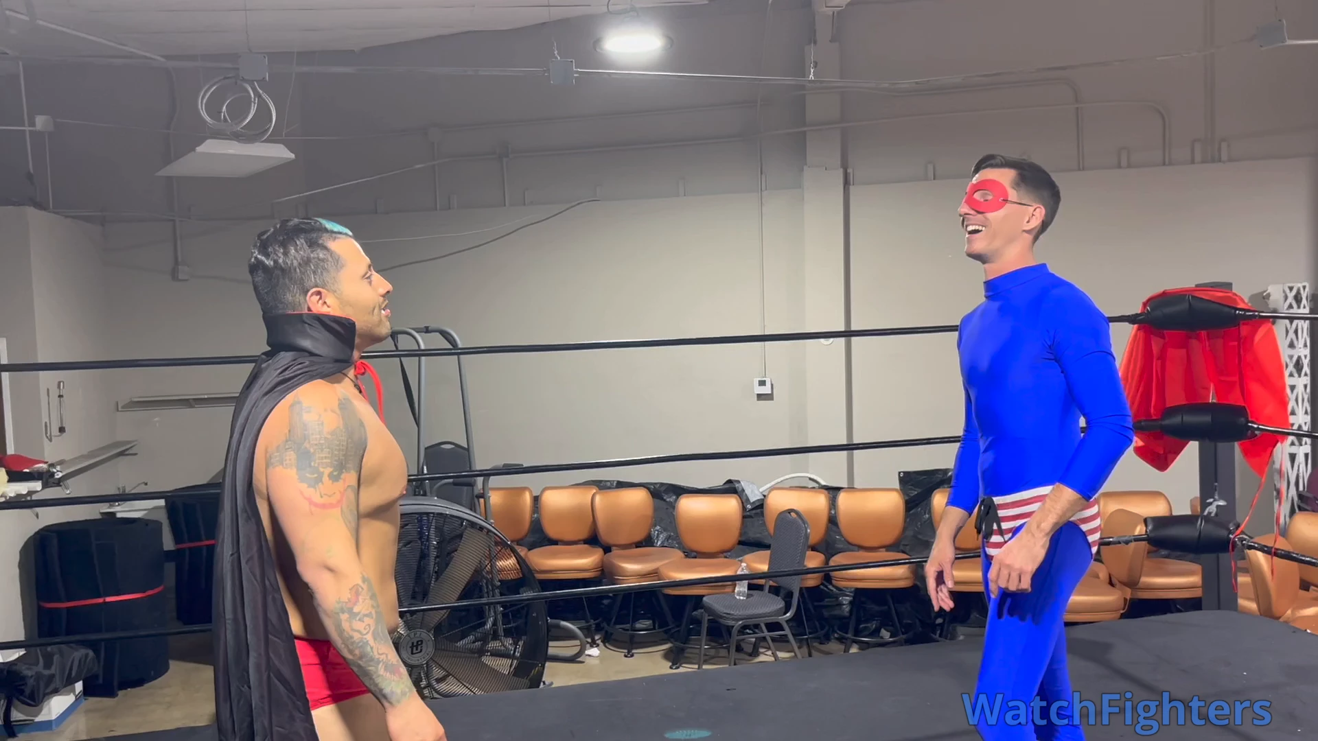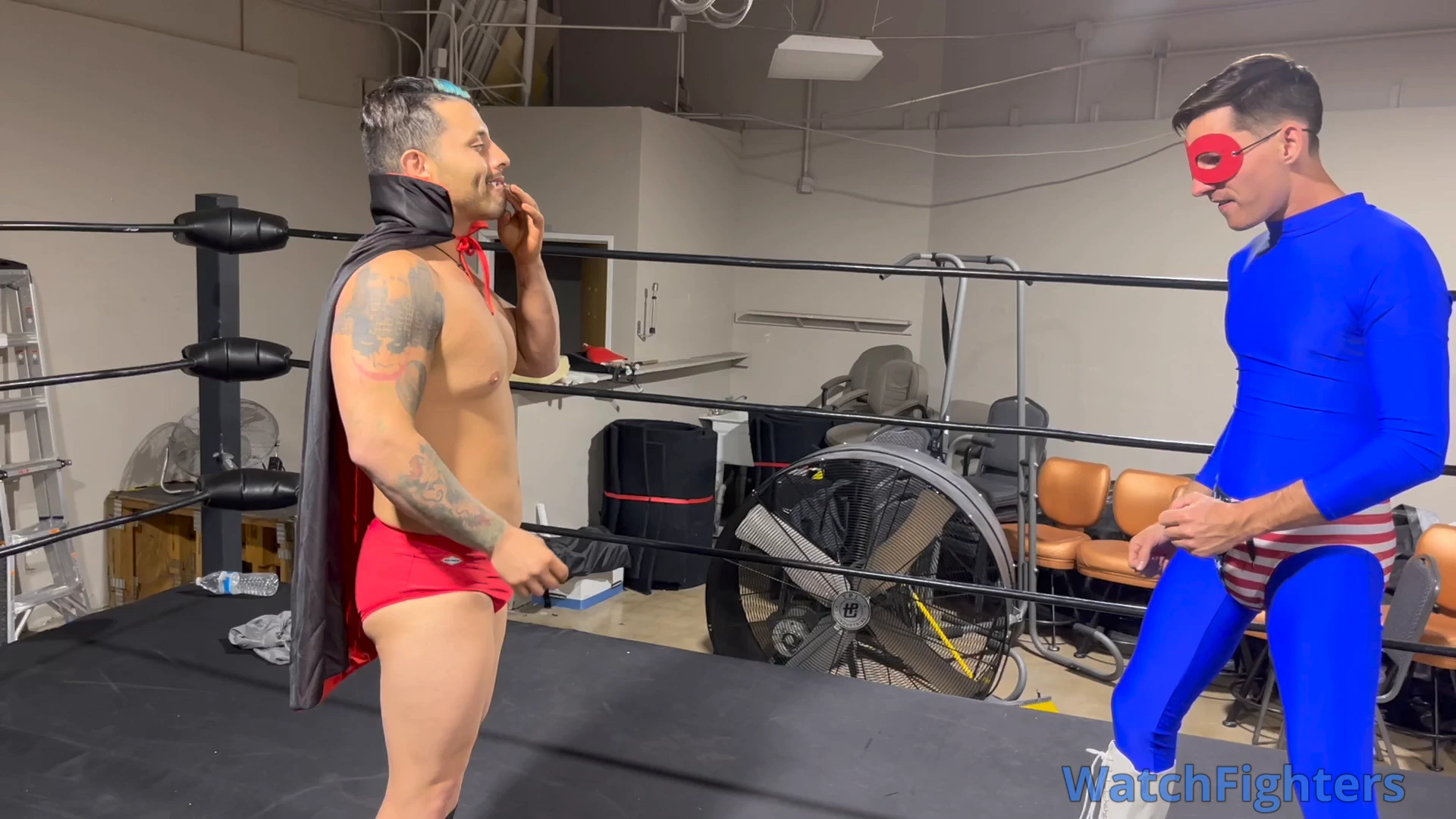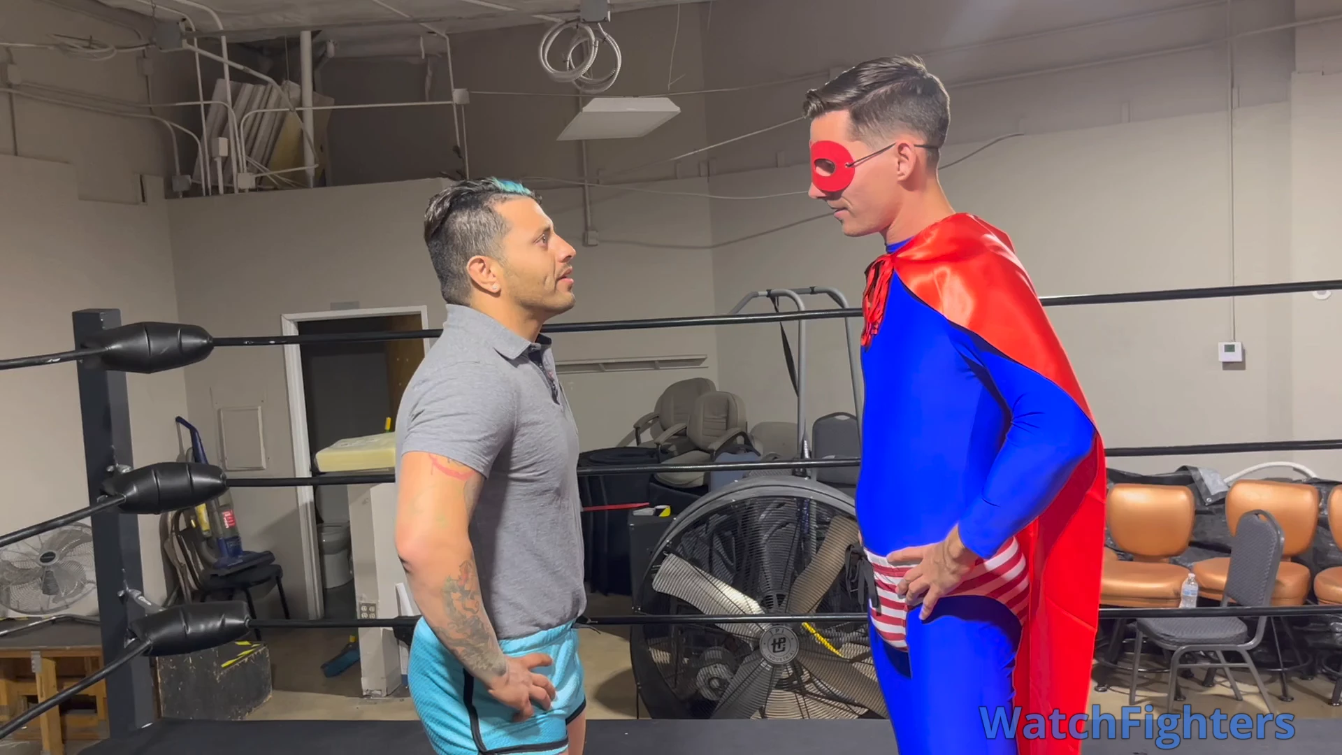 Intrepid reporter Charlie is investigating Coach Vinnie, but neither of these guys have any idea what they're really in for in this Halloween themed clip involving a superhero and a vampire! Featured moves include lowblows, gut bashes, a headlock and stripping to tighty whities!