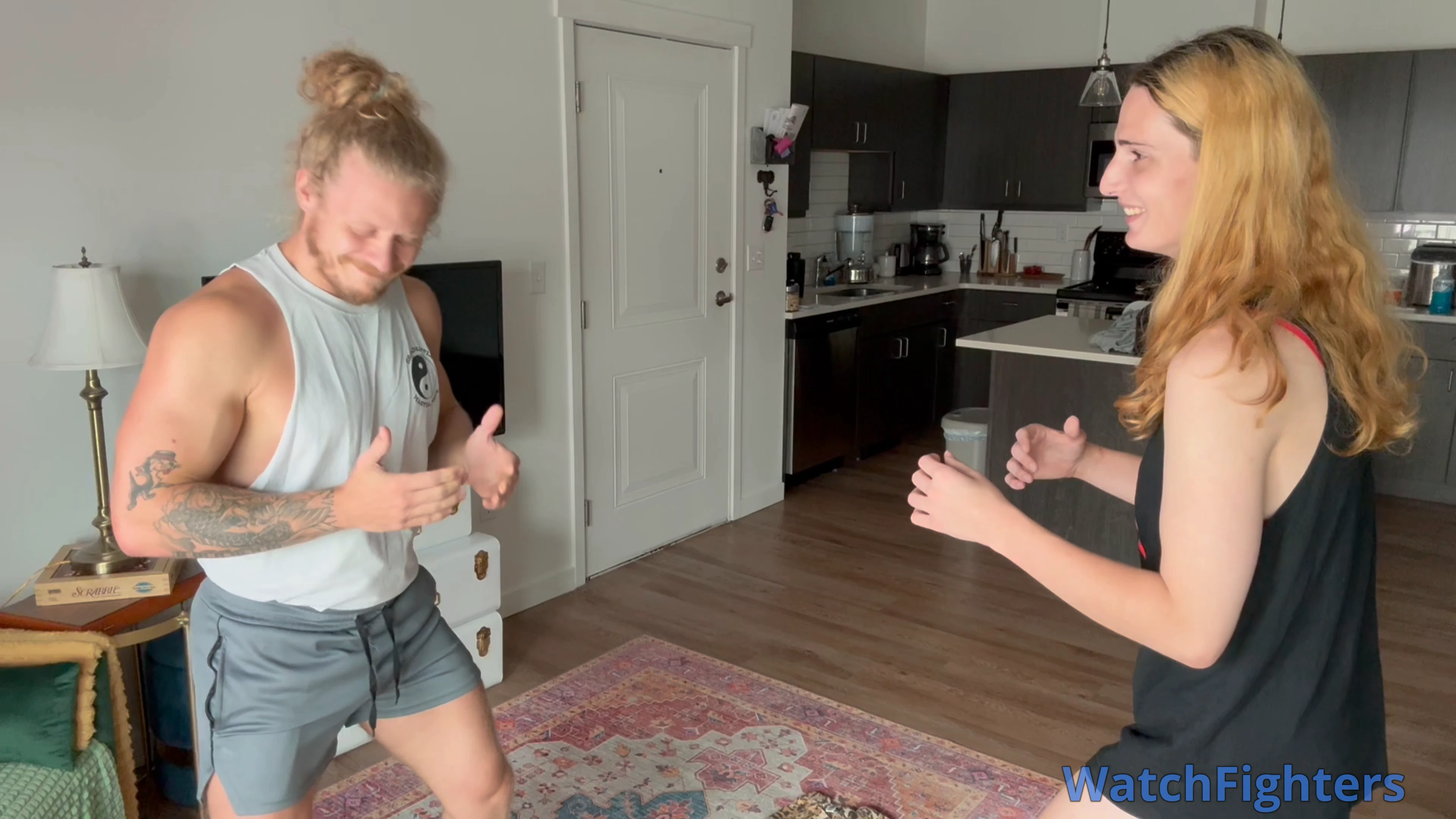 skylar is a pro female who came over to my apartment to grapple. i easily overpower her and slap a classic sleeperhold. while shes weakened, i strip her training clothes off so shes in her underwear. i take off my shirt to inflict more offense on her. she tries to get to her feet, climbing up me, and pulling my shorts down in the process. now im in my underwear too! i manhandle her with a bearhug. i put her in a leg scissors and flex cockily. i get too comfortable and she low blows me and takes control w leg scissors of her own!