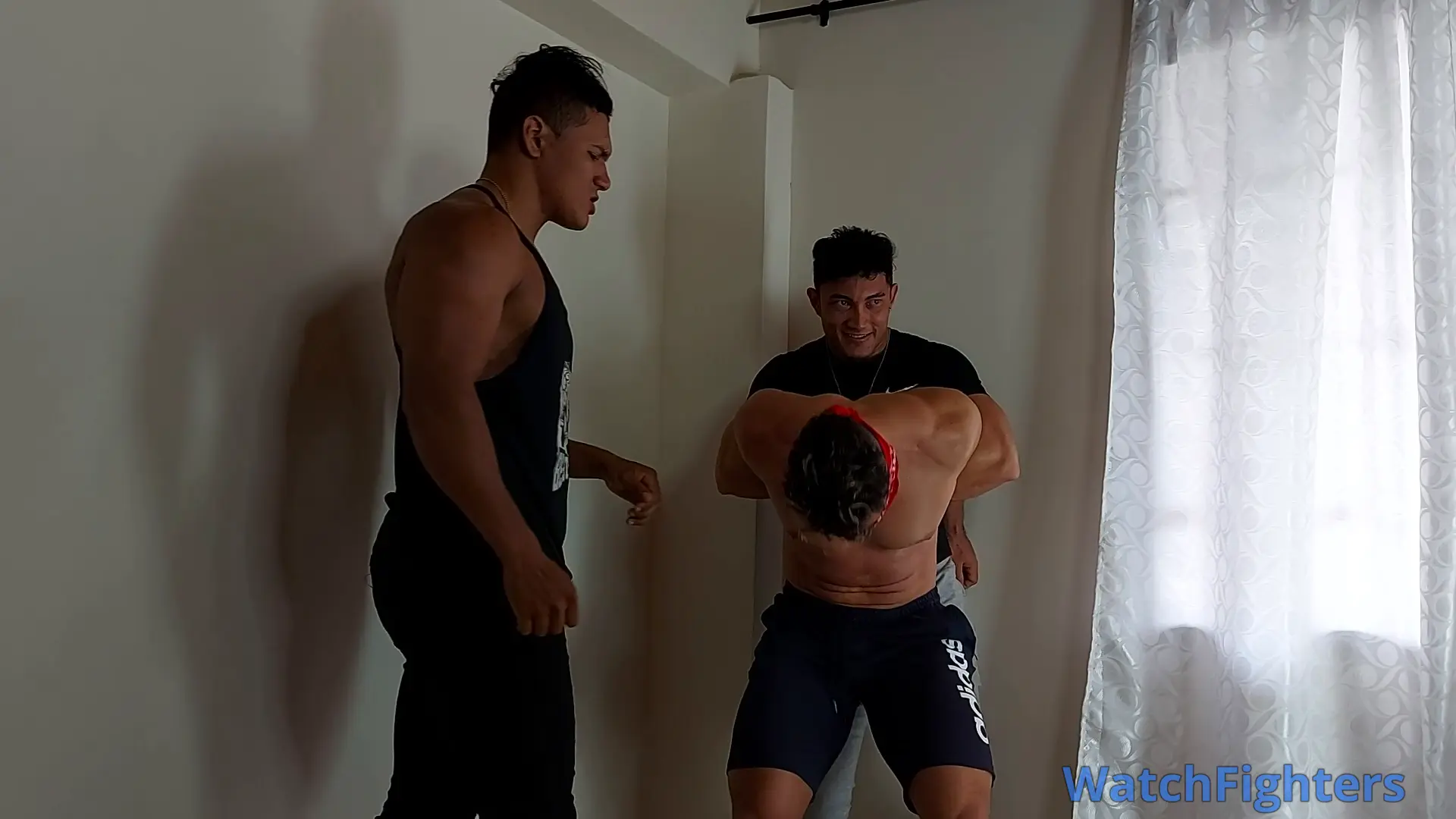 Español: Dos amigos musculosos entran en la habitación de Jack Strong mientras entrena sus abdominales. Mientras admiran sus abdominales, un amigo le lanza un puñetazo en el estómago desprevenido mientras el otro le agarra los brazos por detrás. A continuación, se trabaja con fuerza en el estómago de Jack hasta que está jadeando en busca de aire en el suelo.