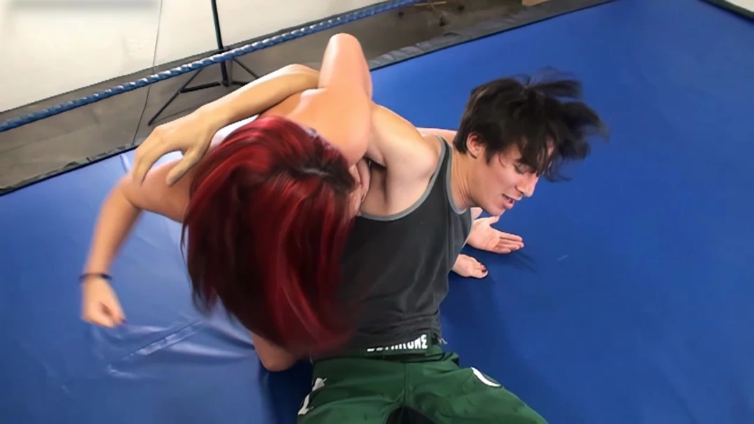 Original description - Kato returns to take on everyone's favorite Canadian, Mutiny! We fade in to Kato warming up in his corner, his lightning quick hands on display. Mutiny looks at him unimpressed and does her best to mimic him. This is a bare knuckle battle and anything goes. Kato starts out strong, overwhelming Mutiny right away. For the first few minutes, Kato manhandles here, then oops! Her top comes off!