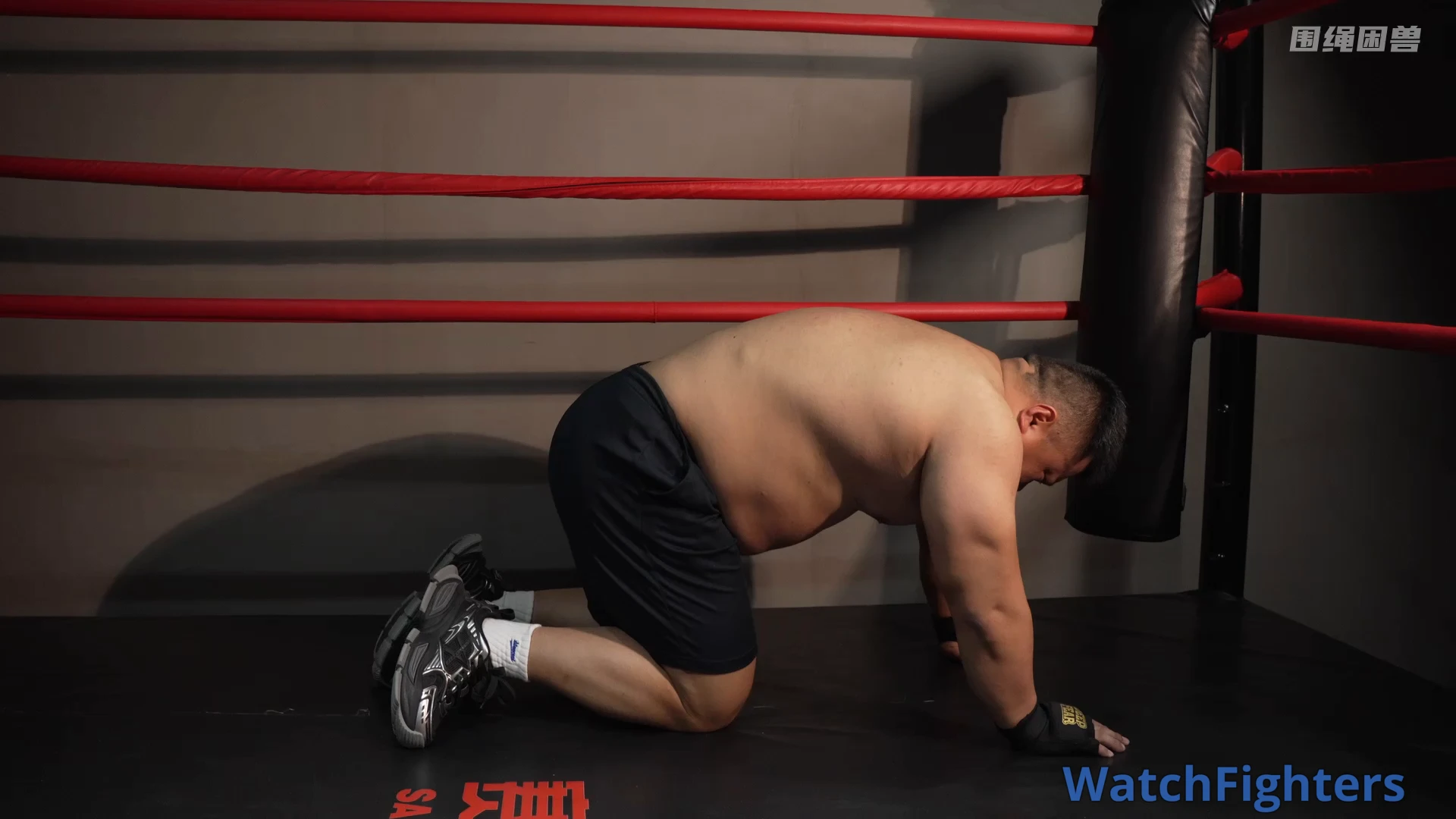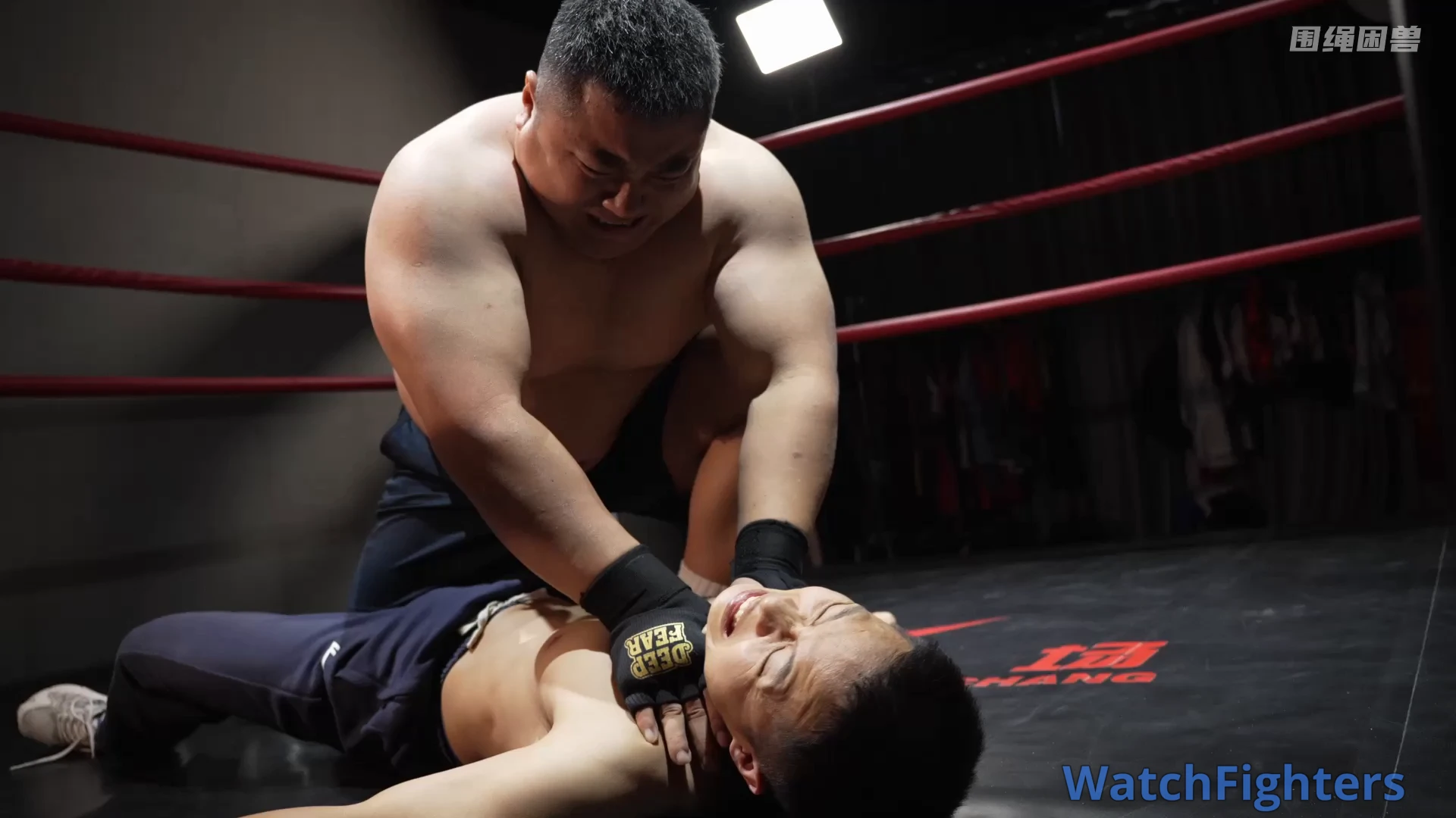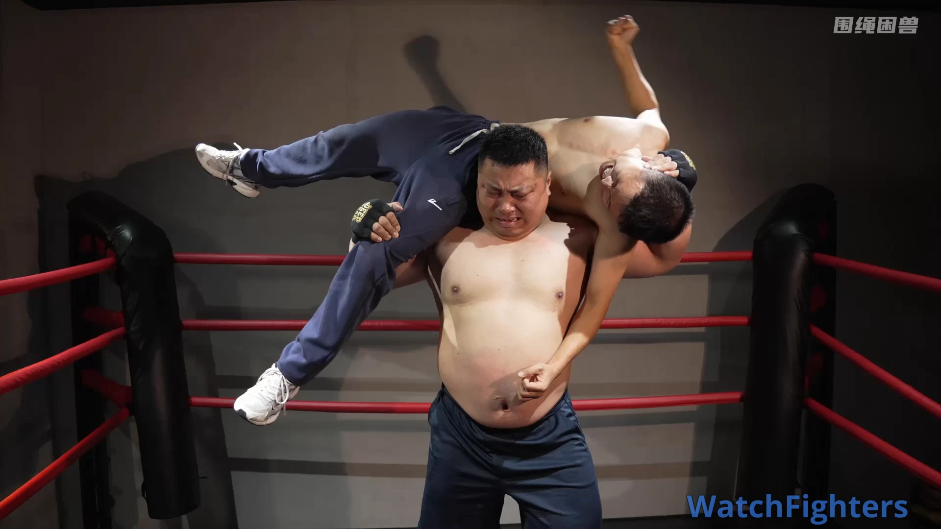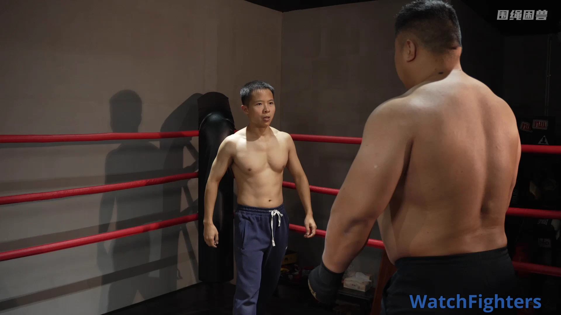 An unfair fight. The smaller guy uses his speed and agility to sneak attack the big man’s groin, and finally wins. No rules fighting.