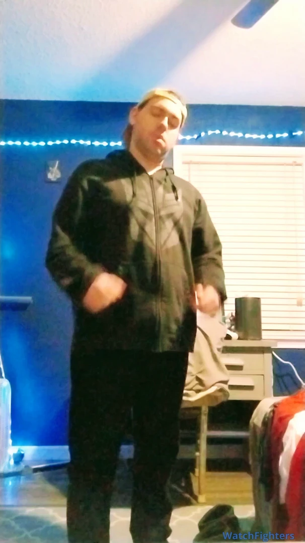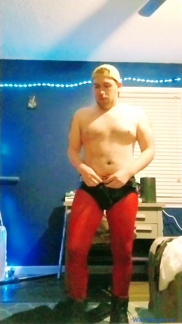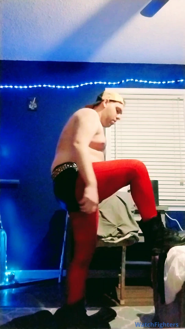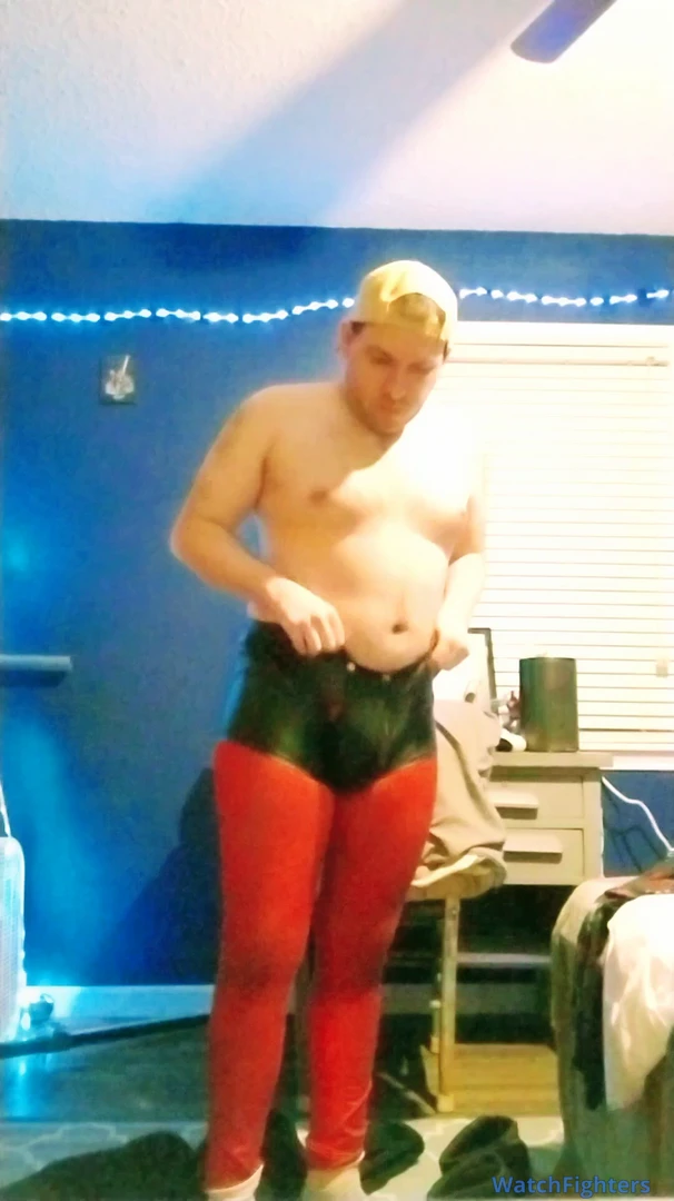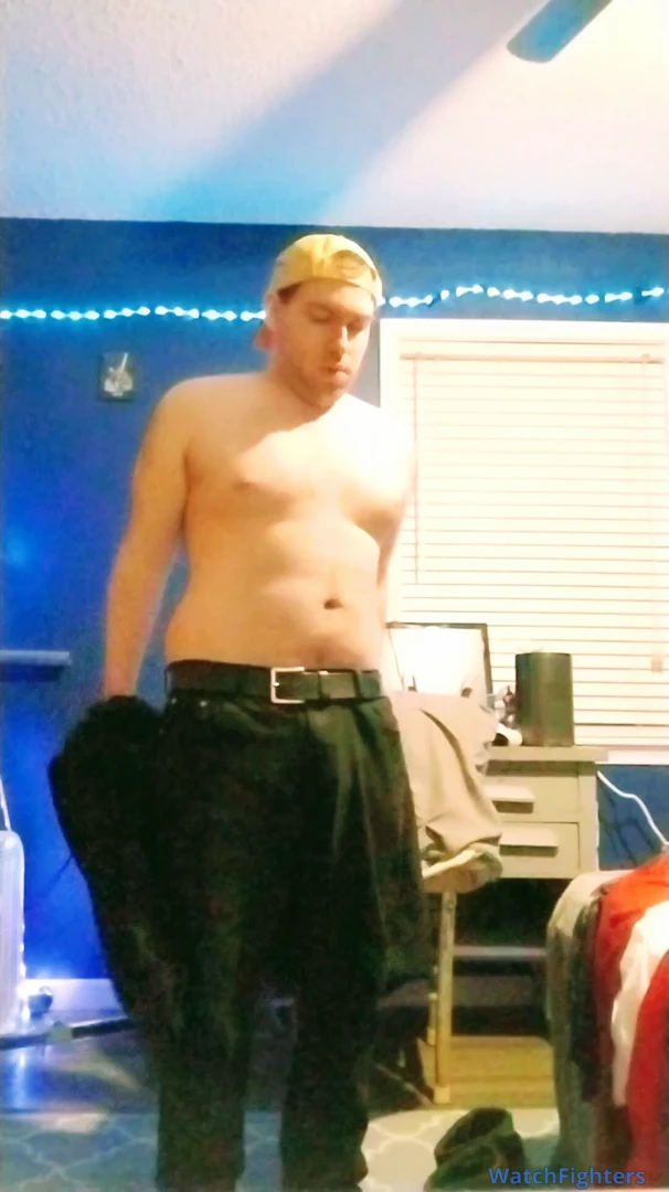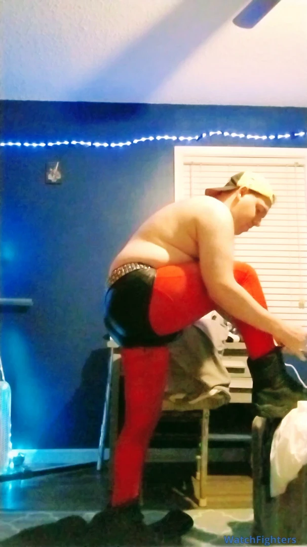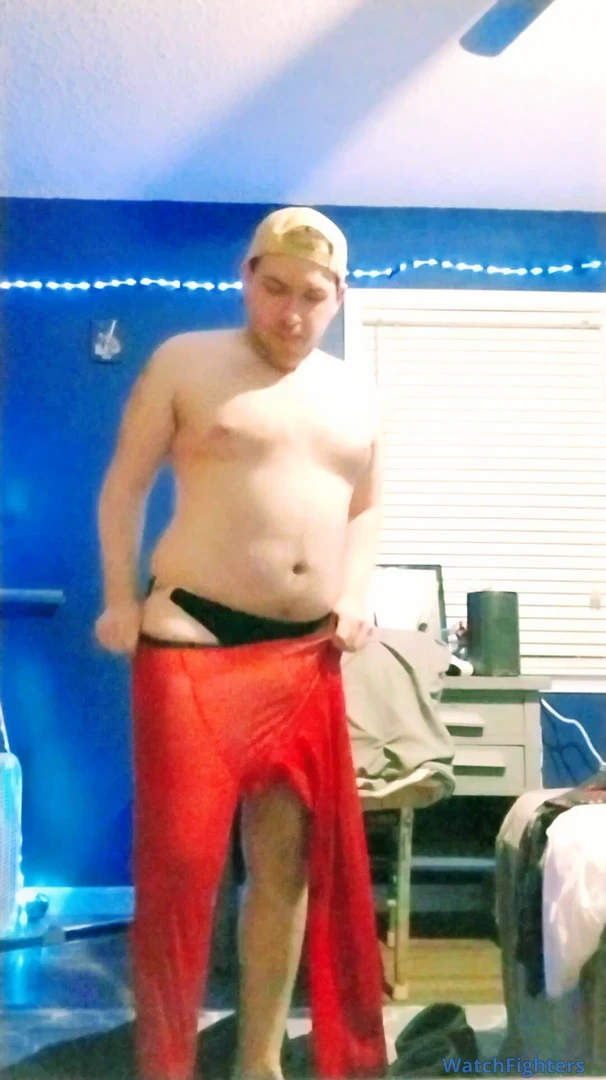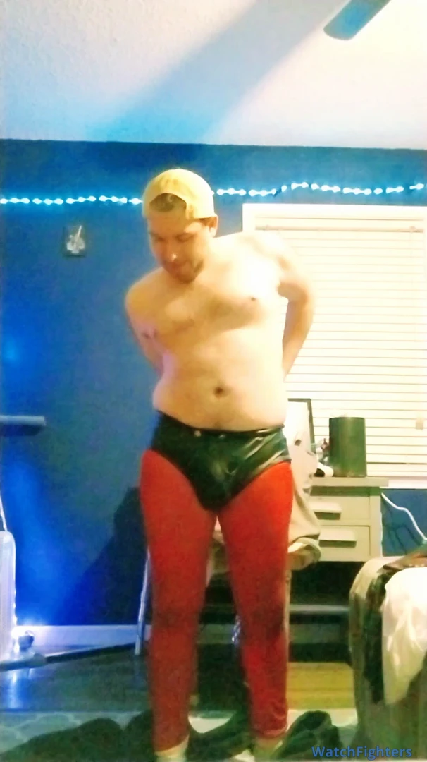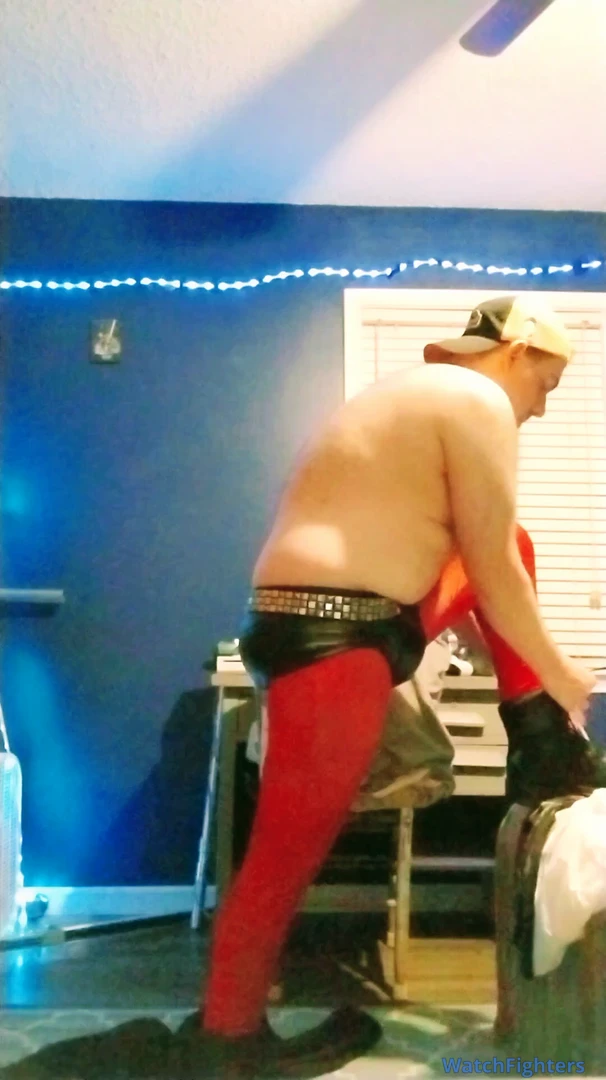 Wrestler takes off his every day clothes and puts on his wrestling gear