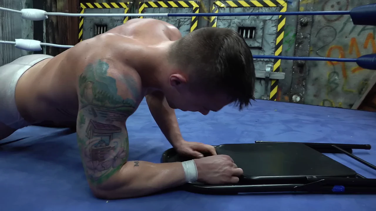 Ty Alexander and Elite Eliot are no strangers to a professional wrestling ring. As Ty is parading in the ring, Eliot delivers a chair shot to his back. A subsequent power slam on the chair and Ty is at a quick disadvantage. Eliot is methodical in his motions and diabolical in his moves. Throwing his opponent hard into the corner, kicks to the midsection, Eliot then decides that he like Ty’s gear and relieves him of his pro gear, leaving Ty in a black latex speedo.