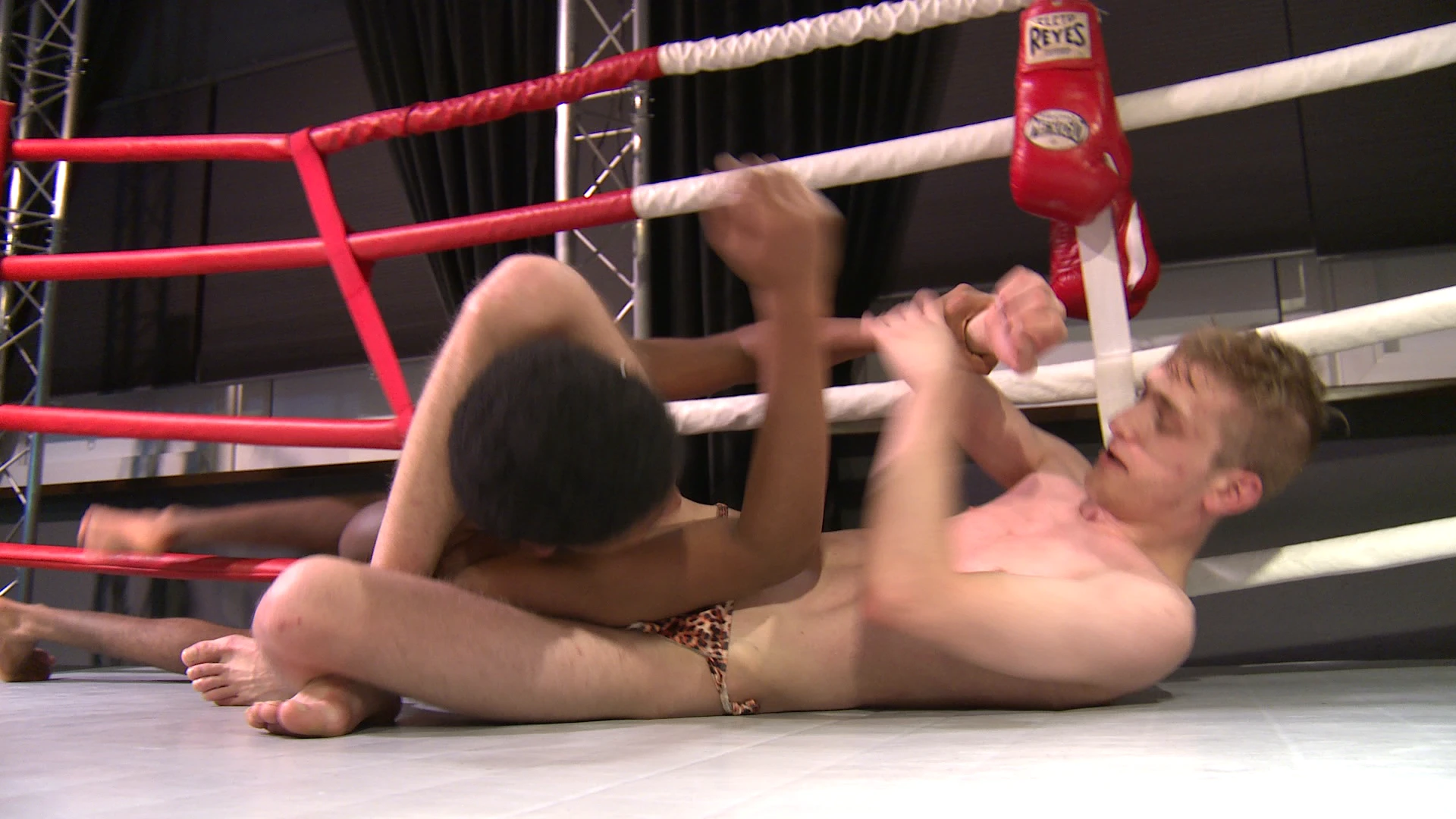 Rivals Moe and Jamie face off at the Fightplace Club. We get to see a fight that's all about honor, strength, and dominance. With each fight, with each round, the two step up their intensity. There's grappling, stripping, and fights where they wrestle with the toughest bandages. Hair pulling, lots of painful low blows, the full program we expect from these two and get to see. Except that in this match, there is even more aggression in the air than usual. See for yourself how the two fight each other, and don't miss the dramatic ending in the last round (in the last part of this series).