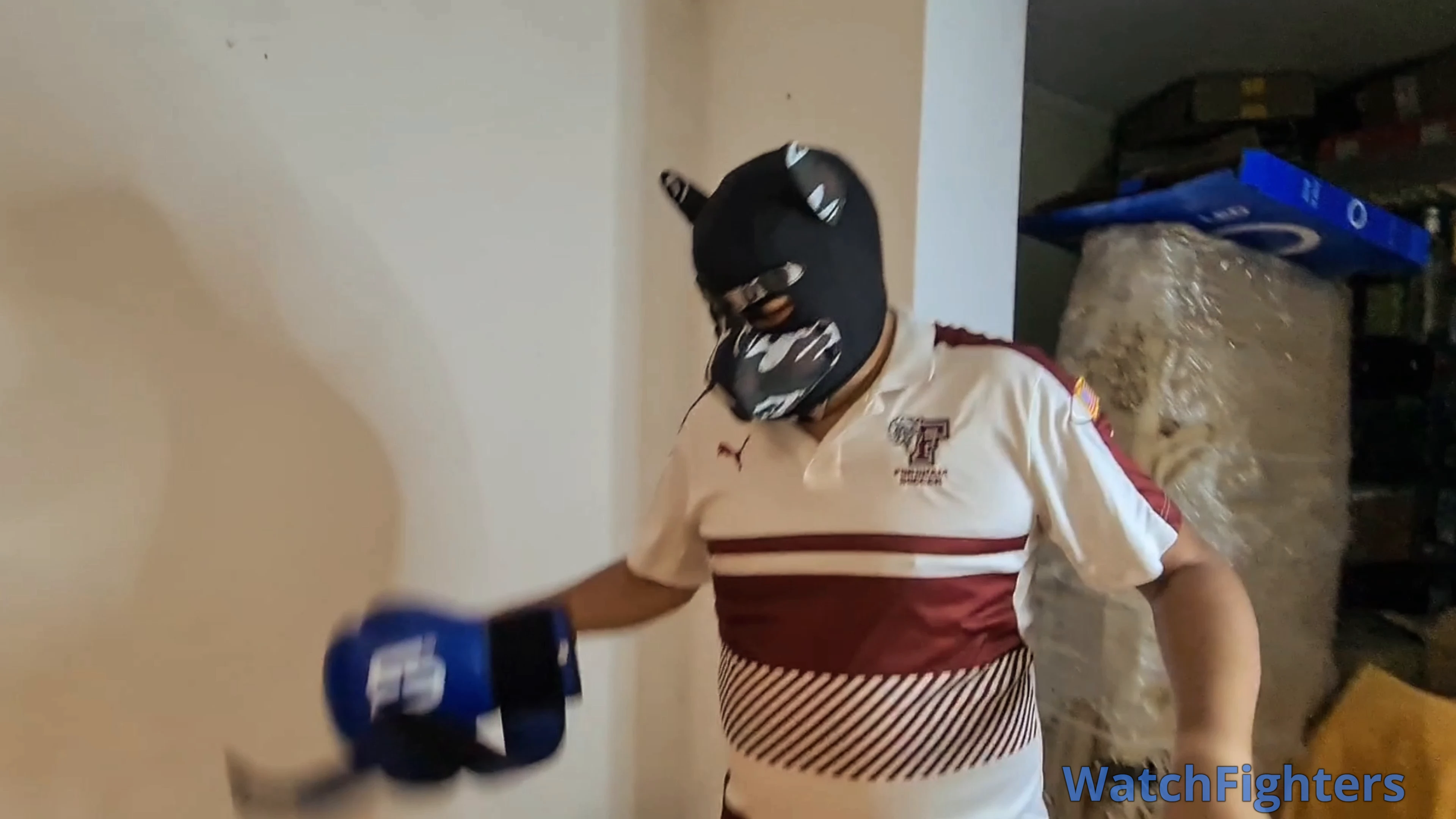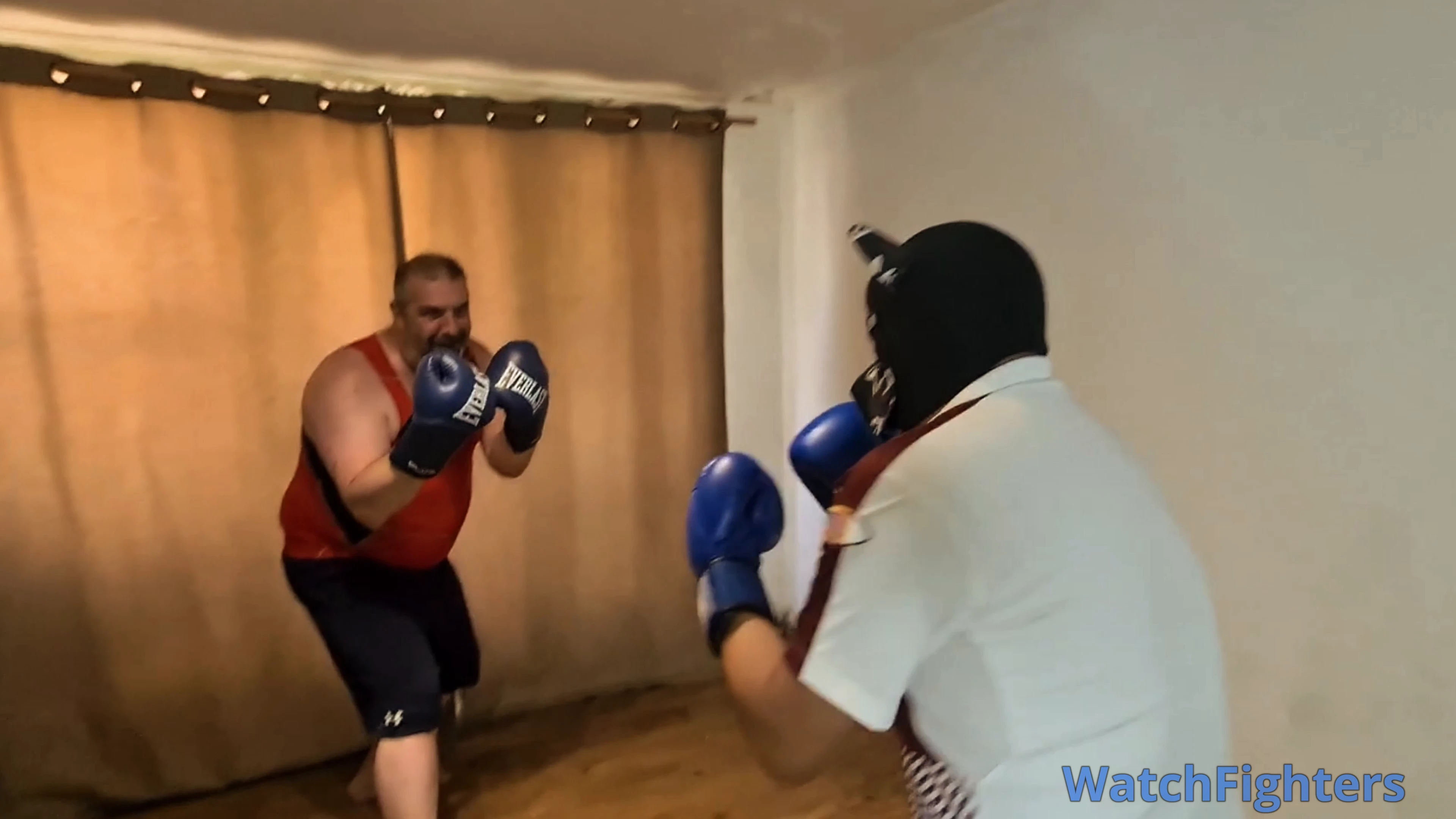 Inside a large private house, in an open living room, Silver Daddy Boxer faces HeteroFighter in an intense boxing showdown. Both fighters start the match wearing boxing gloves, testing each other with controlled movements and measured strikes.