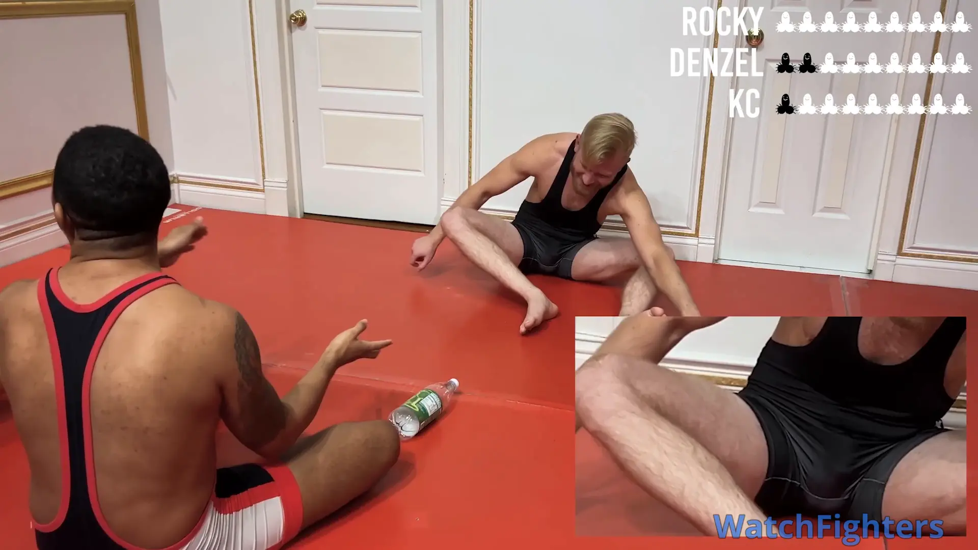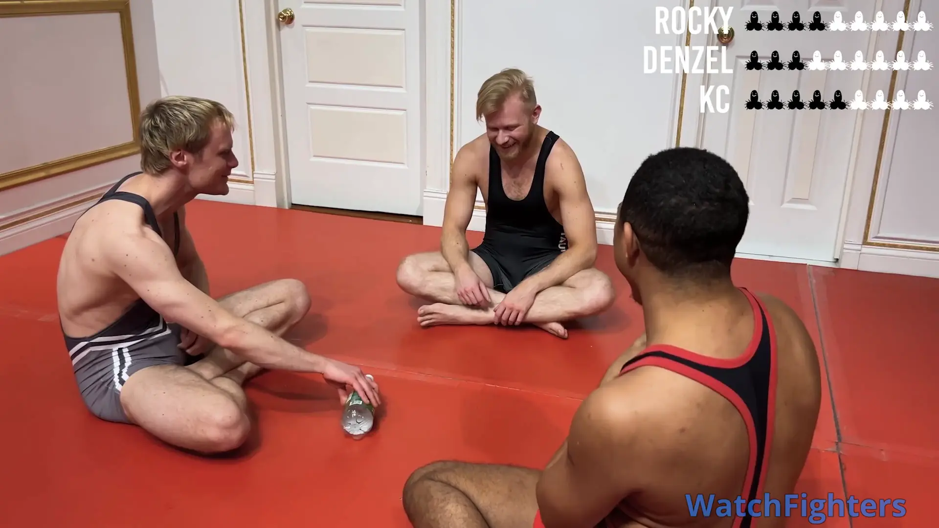 KC, Denzel, and Rocky play a painful as hell game of Spin-the-Bottle nutball in wrestling singlets. Two hits in a row and you gotta take another two with naked balls. Fun and painful as hell.
