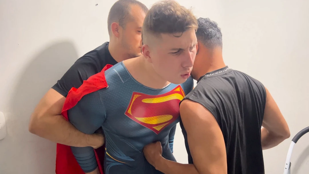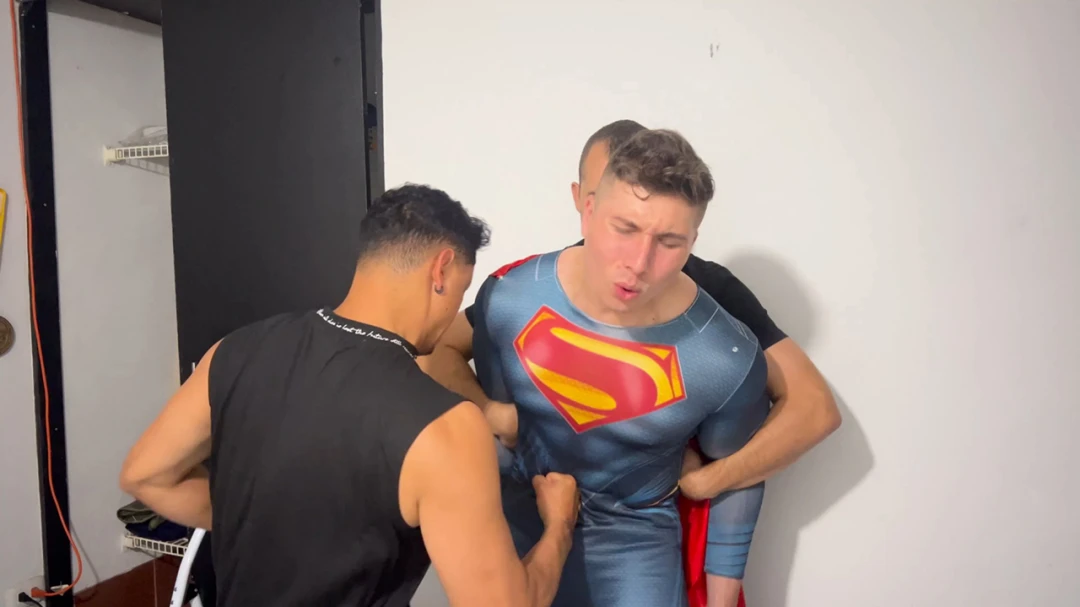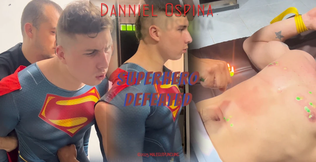 Superhero Danniel Ospina is overwhelmed by two thugs with Kryptonite. Danniel has to endure intense gut punching before being tied down. He suffers hot candle wax on his chest and abdomen, navel penetration, and more gut punching.