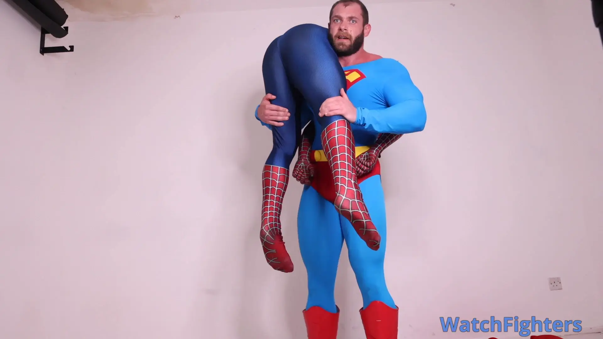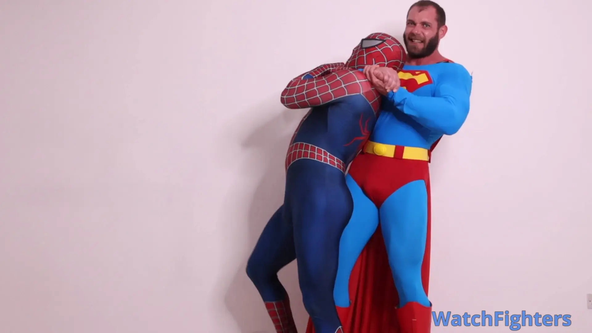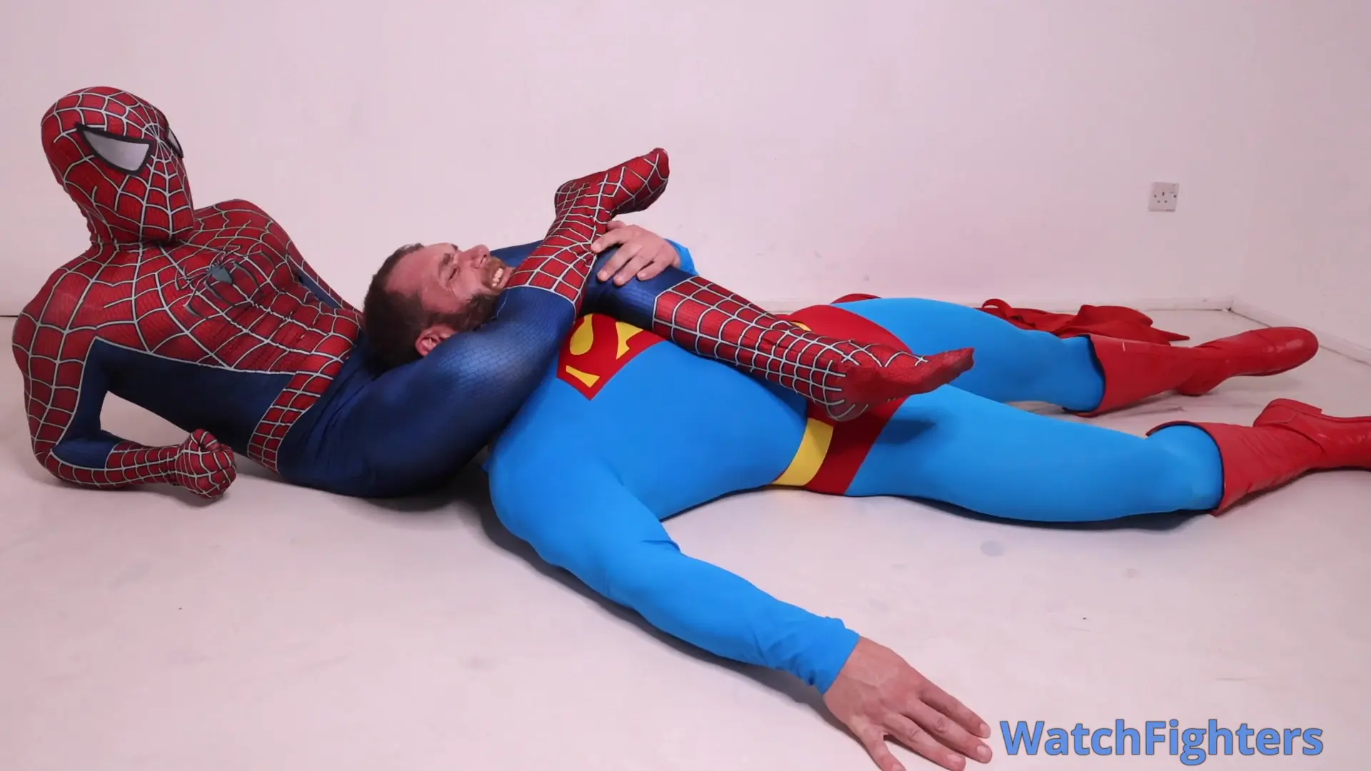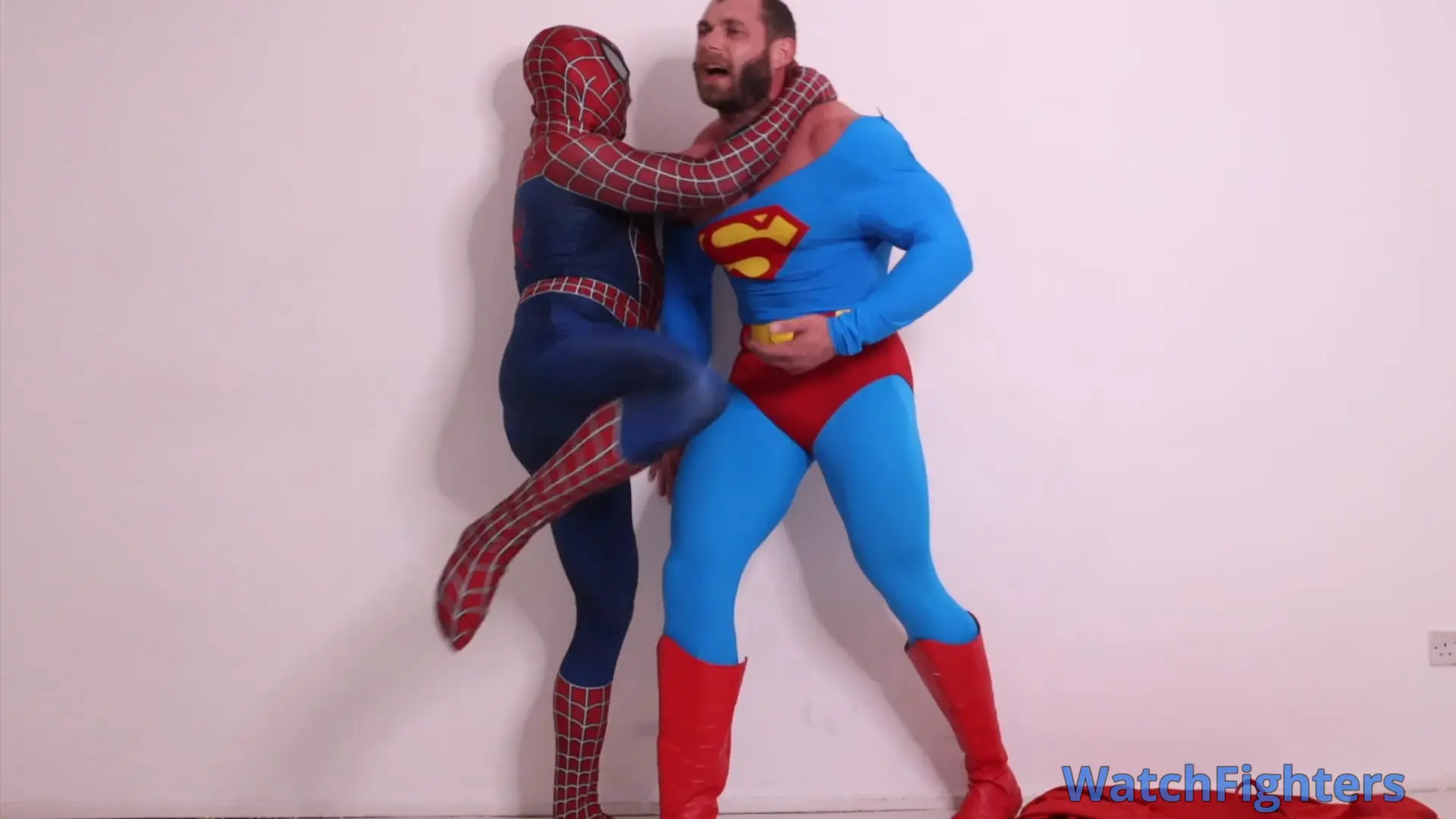 Muscular Superman is attacked by spiderman, both heroes wrestle for dominance. They grapple one another and get into choke holds.