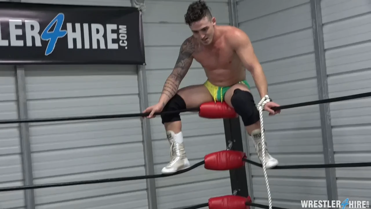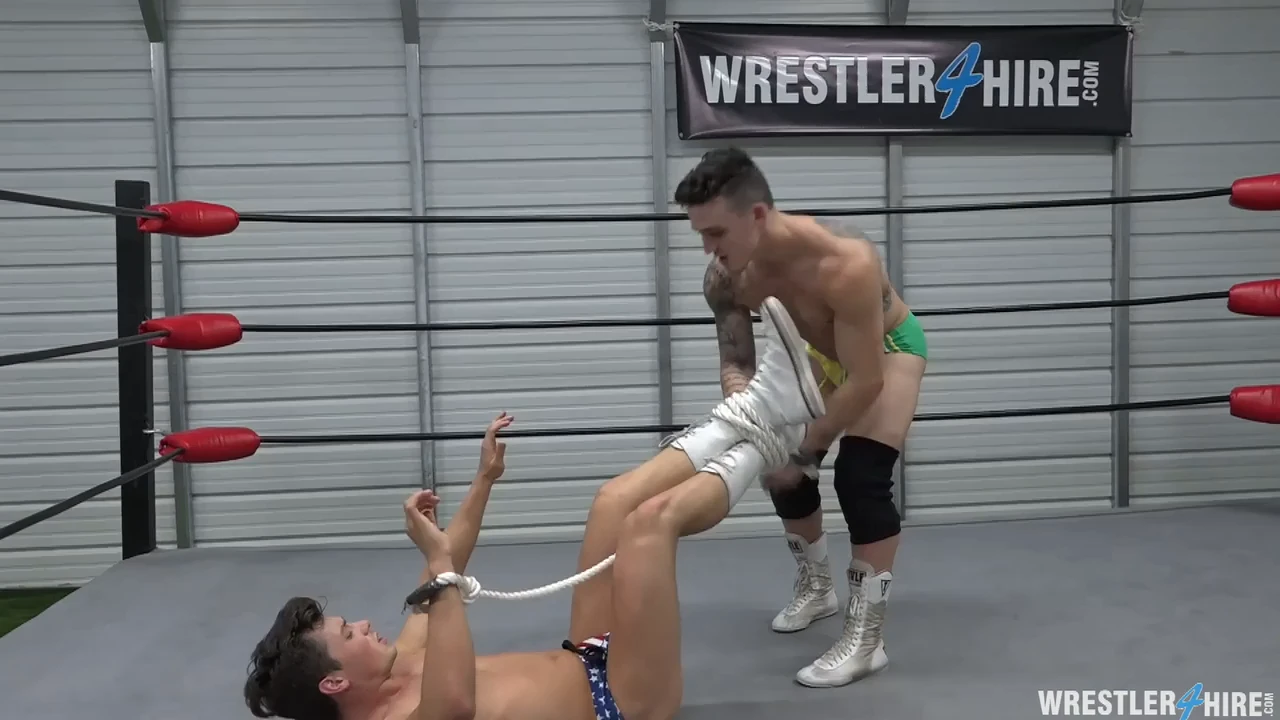 Cam’s confidence disappears the instant he’s wrist-tied. Marco swings him into the corner, wrapping the rope around Cam’s booted feet and hoisting him into a sitting position, giving him ample opportunity to go brutal on those soft abs.