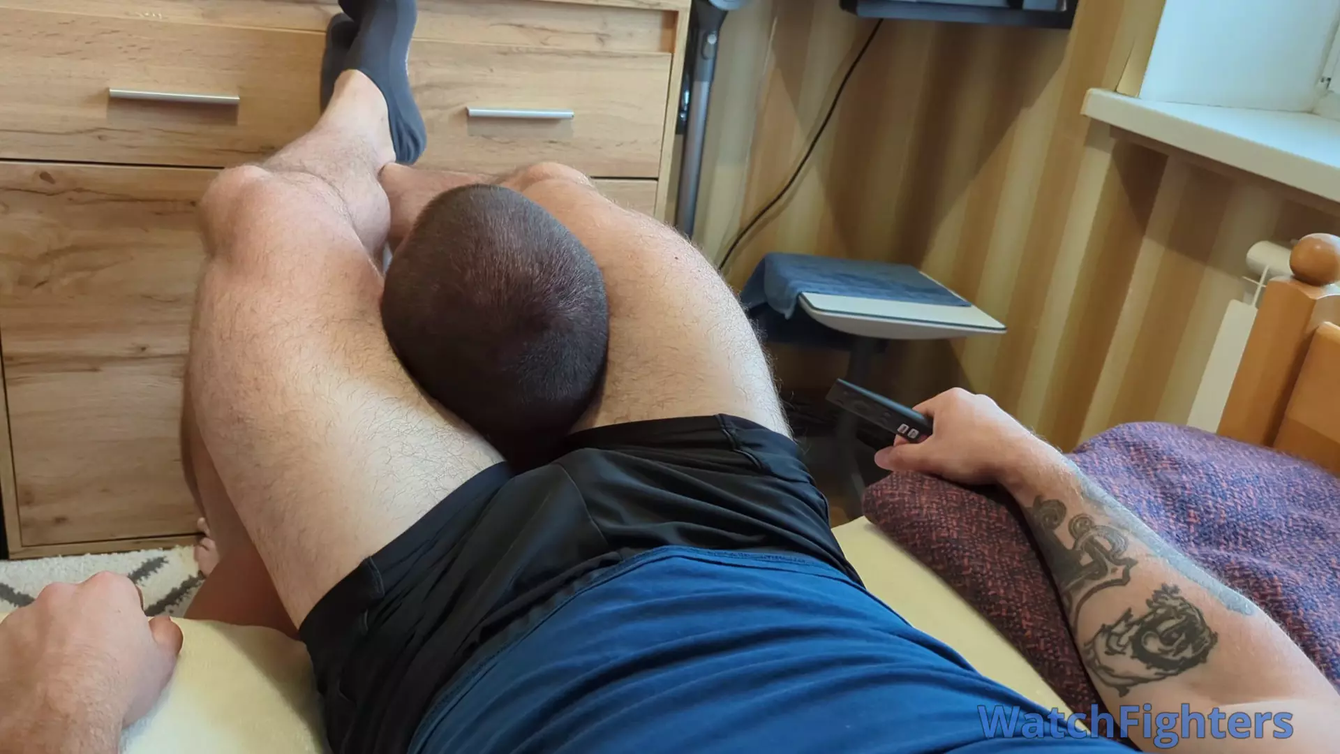 Timur enjoys watching mma fights with Jim squeezed in his muscular legs. No one will ever be able to get out of these legs. Their power and strength are amazing. The muscle definition is excellent. Enjoy )