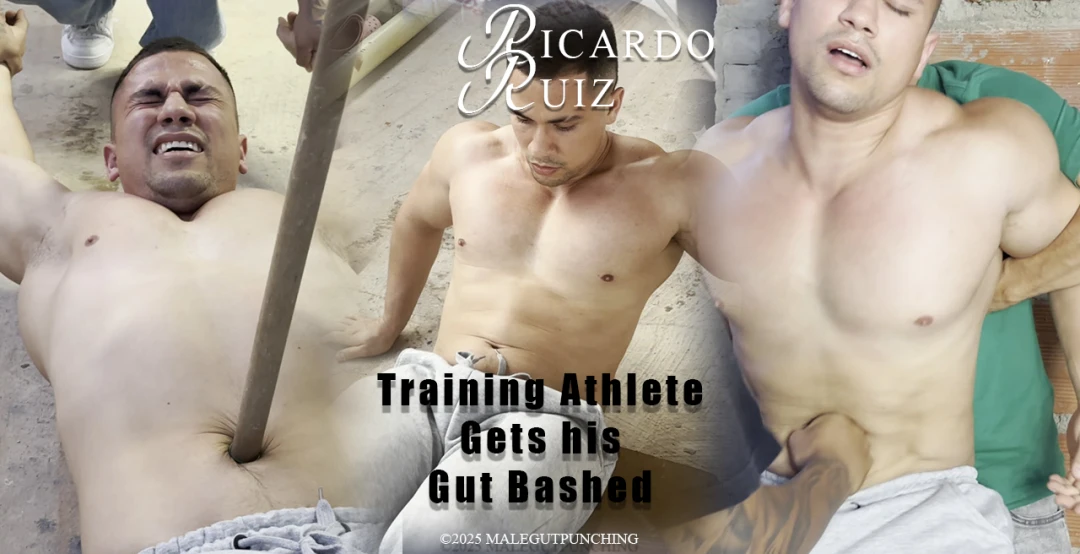 Ricardo Ruiz is training in a construction area. Three men interrupt his training and focus on destroying his stomach. First, with a broom handle in the bellybutton. Then, with intense punches deep in his vulnerable stomach.