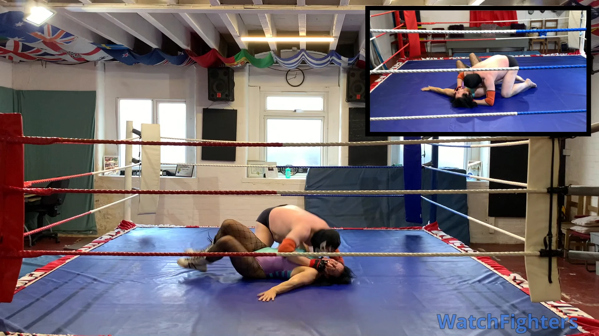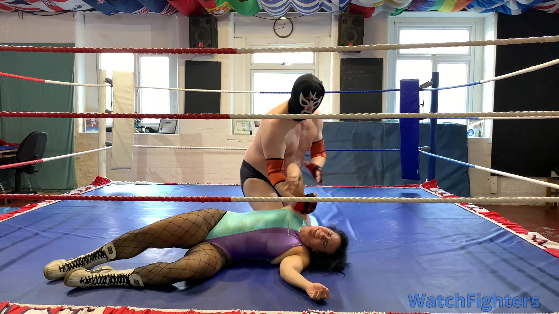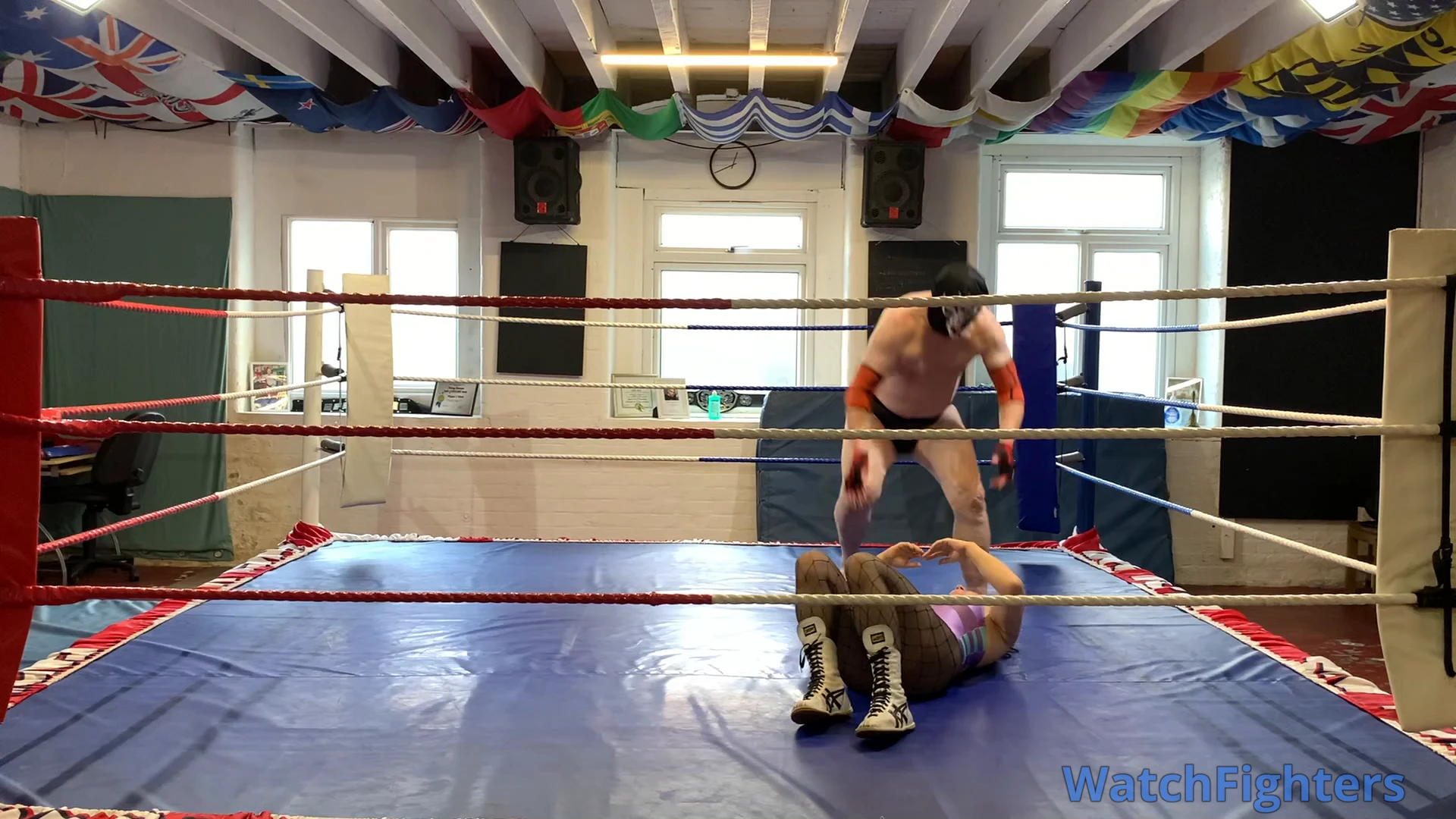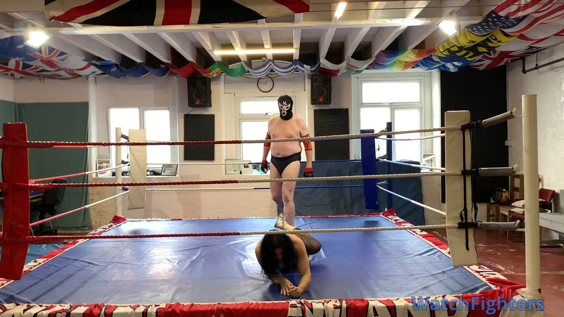 Action from a pro style mixed wrestling match featuring strong female session wrestler Raven v Ghoul held at TWF Manchester.
