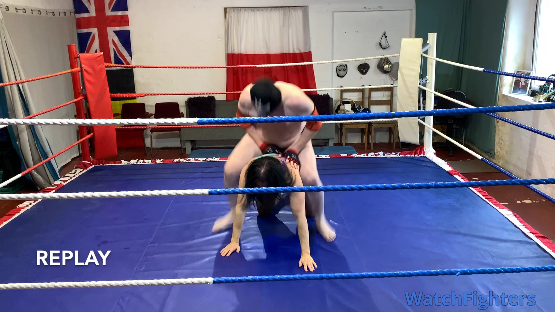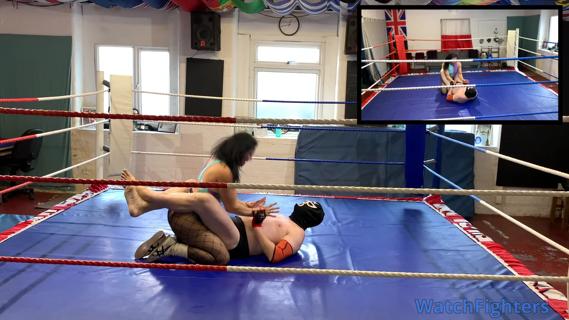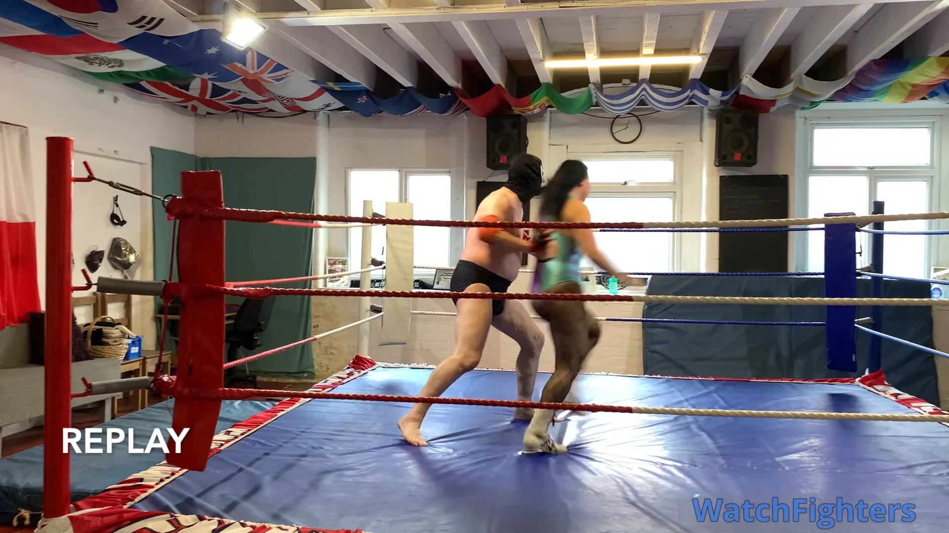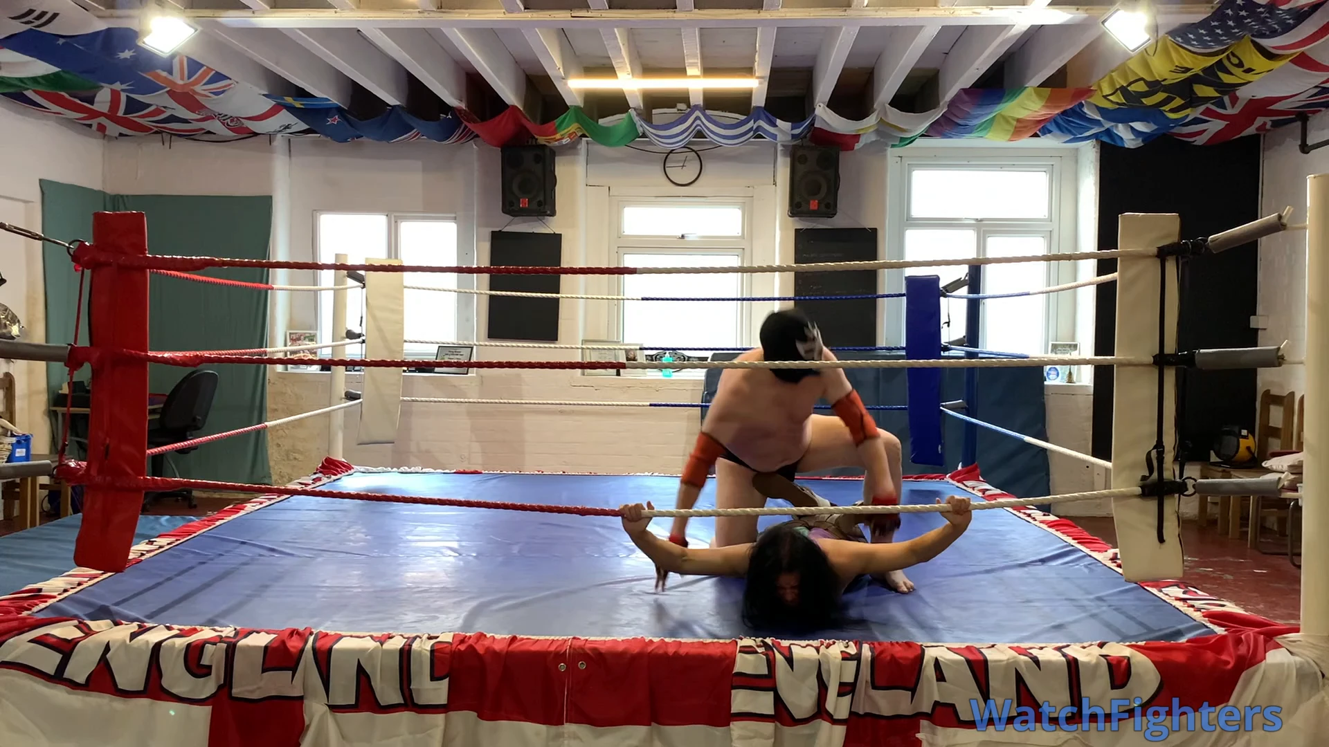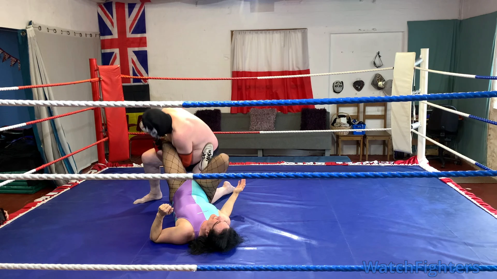 Action from a pro style mixed wrestling match featuring strong female session wrestler Raven v Ghoul held at TWF Manchester.