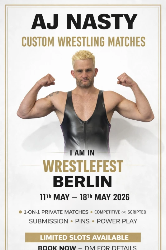 AJ Nasty is heading to Berlin for Wrestlefest from 11th–18th May 2026, bringing his hard-hitting, no-nonsense style to the city. If you’re looking for custom matches, private sessions, or exclusive content creation, this is your chance to work with one of the most intense and uncompromising heels on the scene. Whether it’s ring action, tailored shoots, or something more personalised, AJ Nasty delivers attitude, presence, and a performance you won’t forget. Limited availability during the week—serious enquiries only.